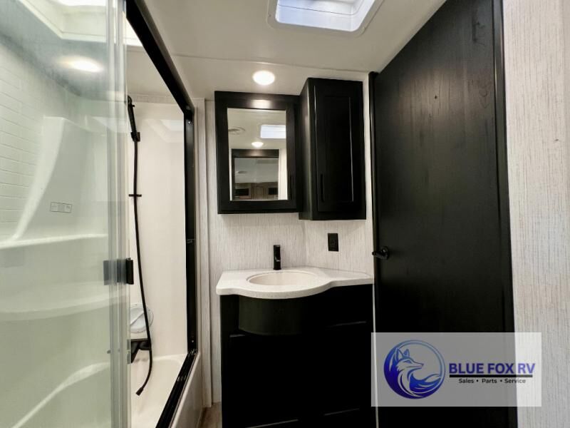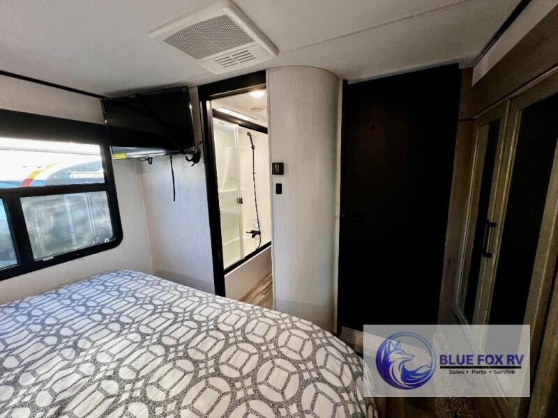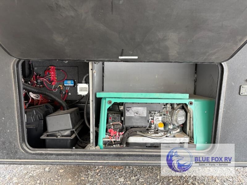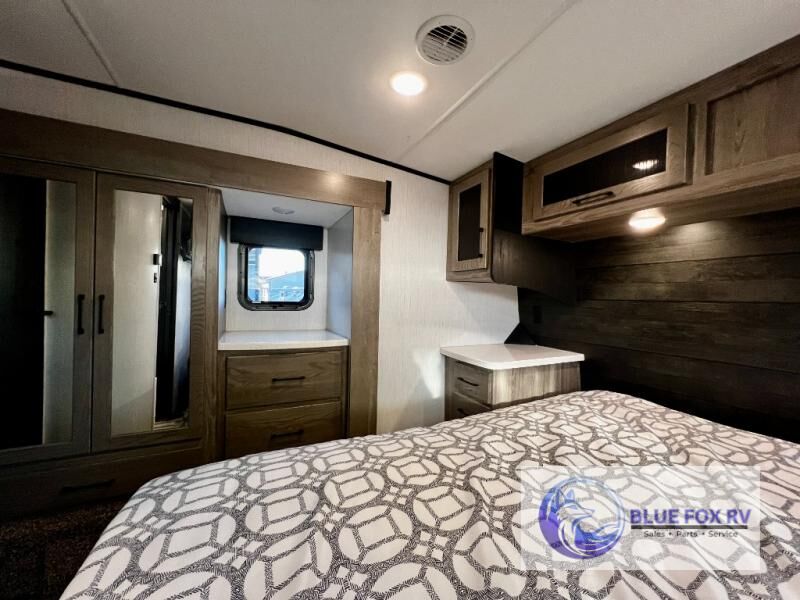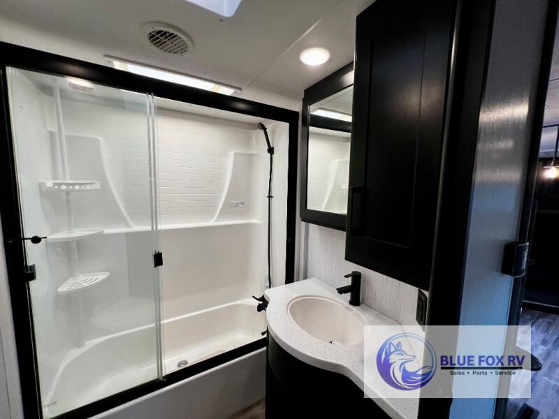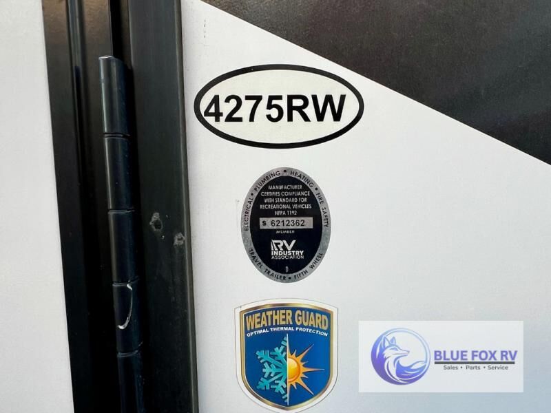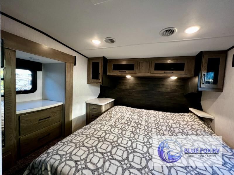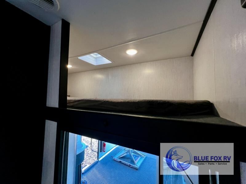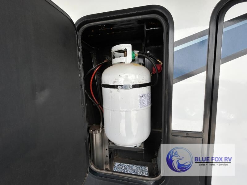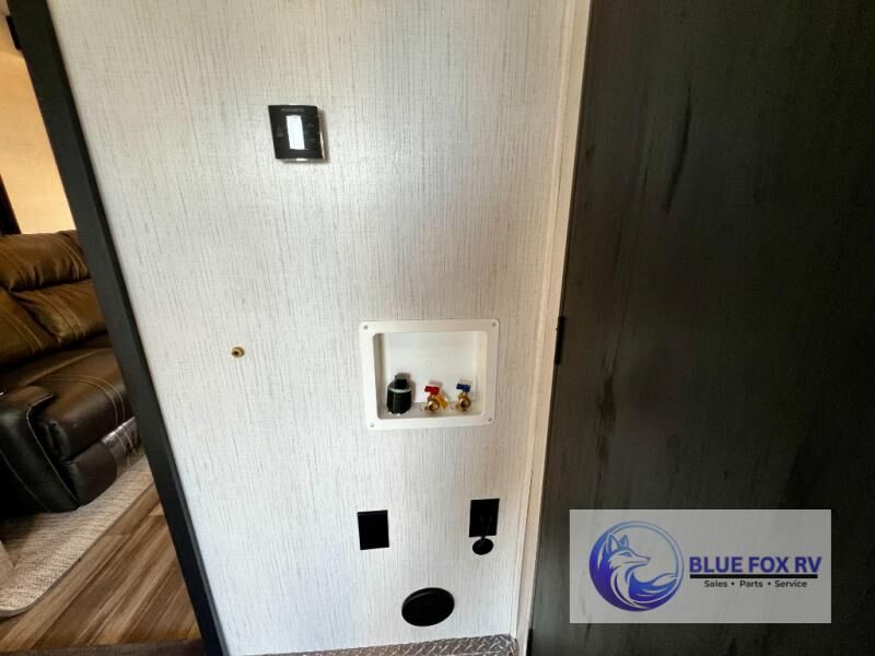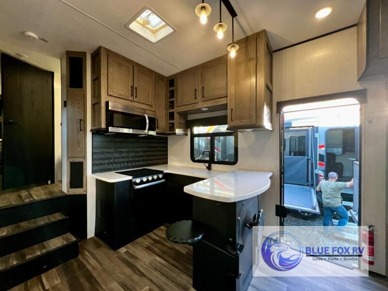Do you desire a luxurious weekend getaway, and want to bring along your favorite off-road toy with you? Then load up your ATV into 13' of garage space (see photo for more measurements), and head out! You can enjoy the comforts inside including a bath and a half, an LED TV in the living room, full kitchen amenities, and two swivel stools at the kitchen counter. What better way to relax after a fun filled day than to sit on the sofa with a USB station in front of the fireplace while drinking your favorite beverage. The free standing dinette with chairs is the perfect spot to enjoy your meals at or play a card game. You can use the unique side patio as a storage area and/or an outdoor above-ground living area. And when you're ready to hit the sack, head into the front private bedroom for a good night's rest on the king bed! There are options and packages to enhance this already loaded fifth wheel, check them out!
