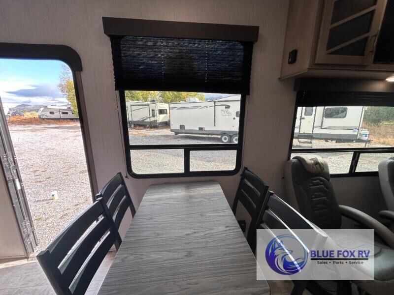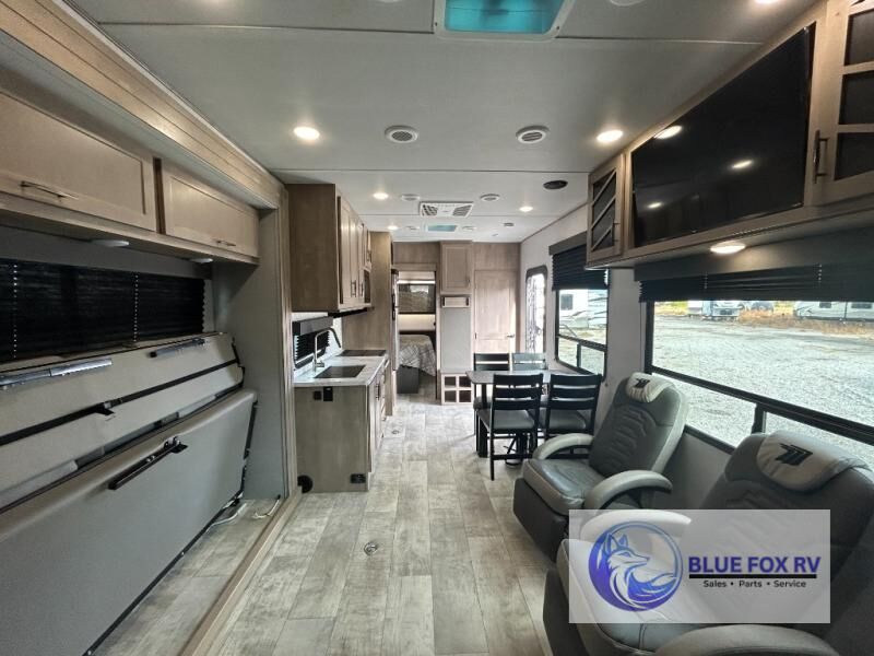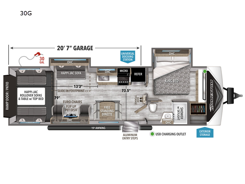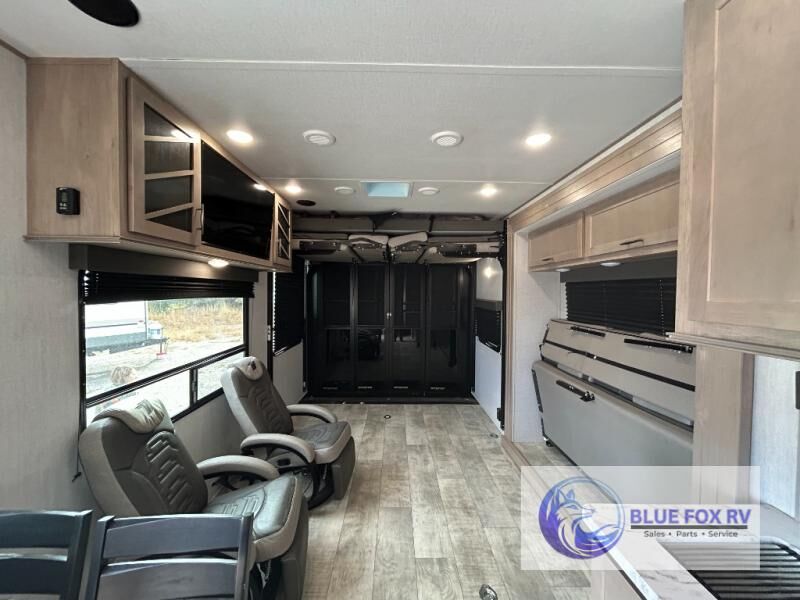 The whole family will love camping in this Momentum G-Class toy hauler! It features a front corner master suite with a king bed, USB charging outlet, and an entrance into the dual-entry bathroom which has a walk-in shower with a skylight. Just outside the bathroom is a bench with shoe storage for you to easily put your shoes on before leaving the unit. The kitchen has everything you will need to create your best home-cooked meals including a three-burner range with oven. You can enjoy your meals at the free-standing dinette and then play a card game or relax on the sofa across from the 40" LED HDTV. The Euro chairs would be a comfortable place to relax too. In the rear, there are Happi-Jac rollover sofas with a table and a top bed above for added sleeping space!