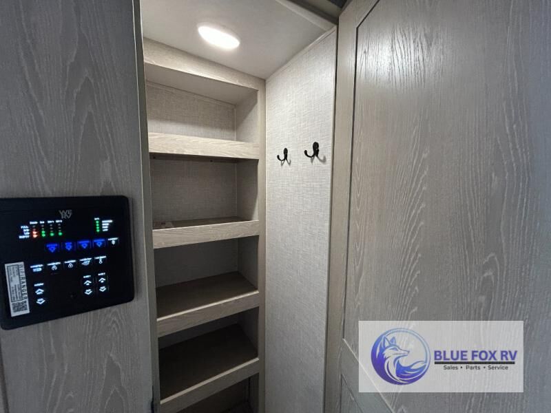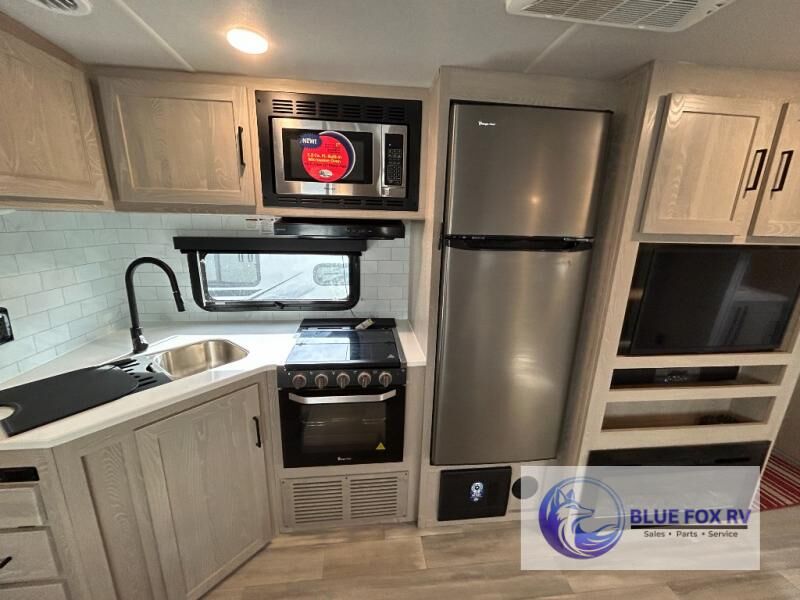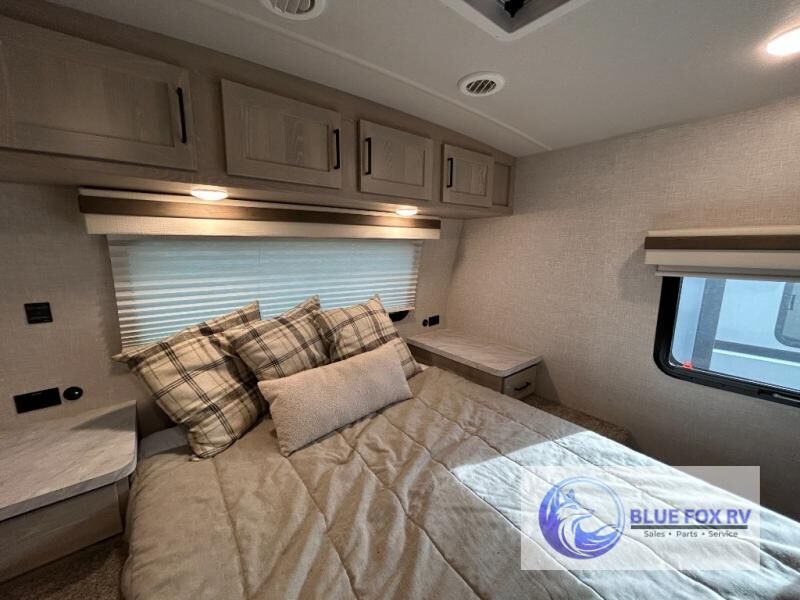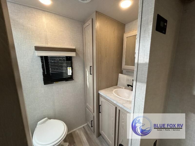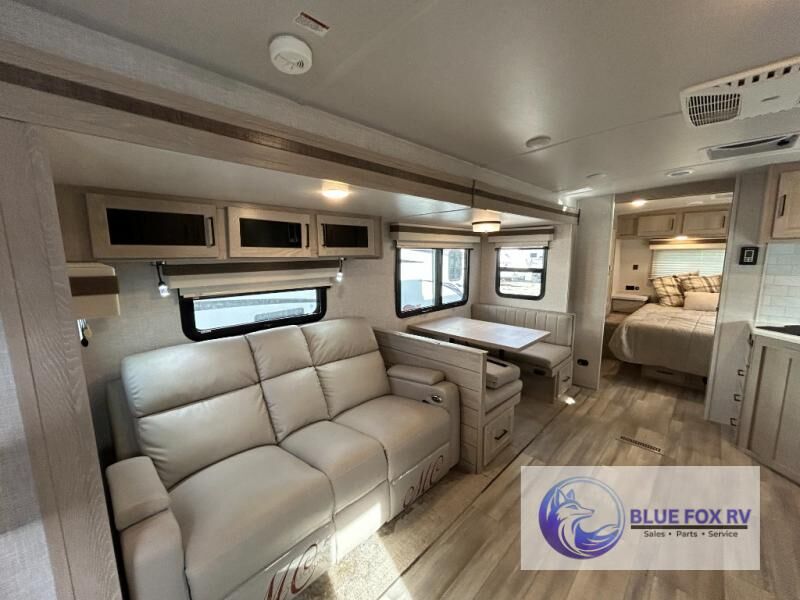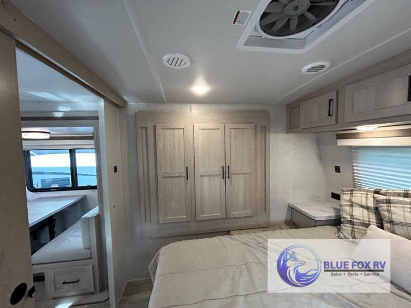 This trailer is the perfect couple's retreat with its private bedroom up front which includes a queen bed, a slide out wardrobe and a TV option. The spacious rear full bathroom provides a shower and linen storage, and a space savings sliding door. The cook will have full amenities including a counter extension for more prep space, and a pantry below the LED TV and entertainment center. The booth dinette offers inside dining as well as sleeping space, and the theater seating is a great place to relax.