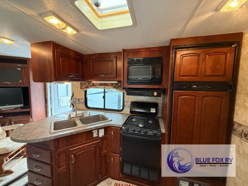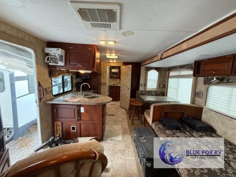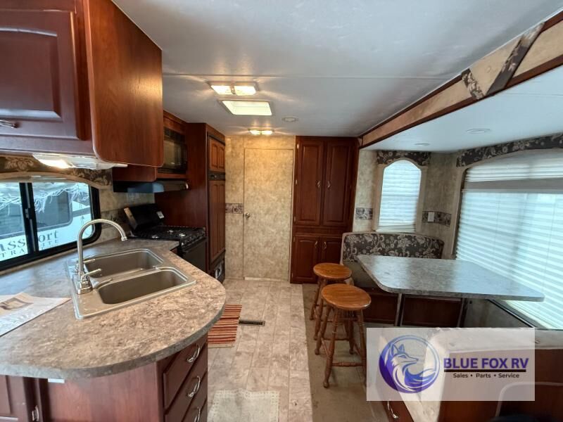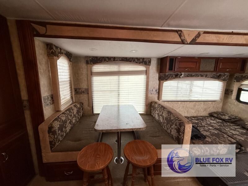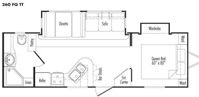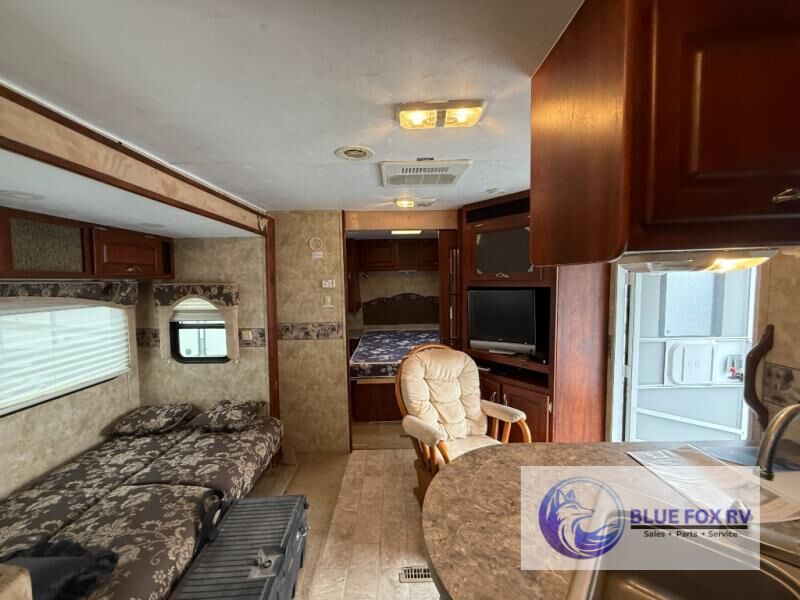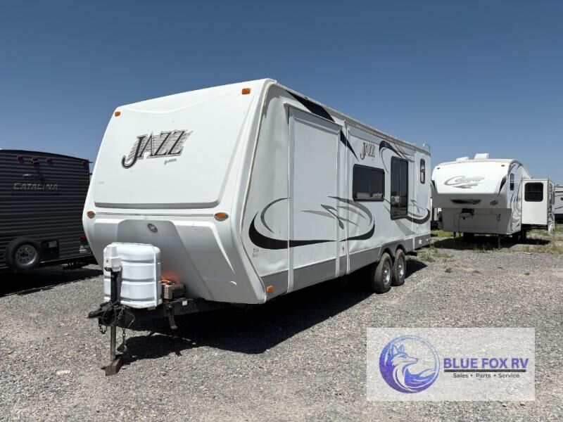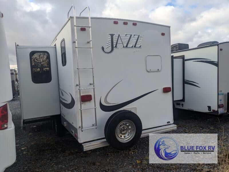 Single Slide Jazz Travel Trailer w/Full Rear Bath Including Corner Shower, Linen Cabinet, Lav., Counter Space & Toilet. Also Includes Booth Dinette & Sofa Slideout, Refrigerator, 3 Burner Range, Double Kitchen Sink, Counter Space w/2 Bar Stools, Ent. Center, Front Queen Bed w/Wardrobes Both Sides, Large Slideout Wardrobe, Overhead Cabinets Throughout and Much More.