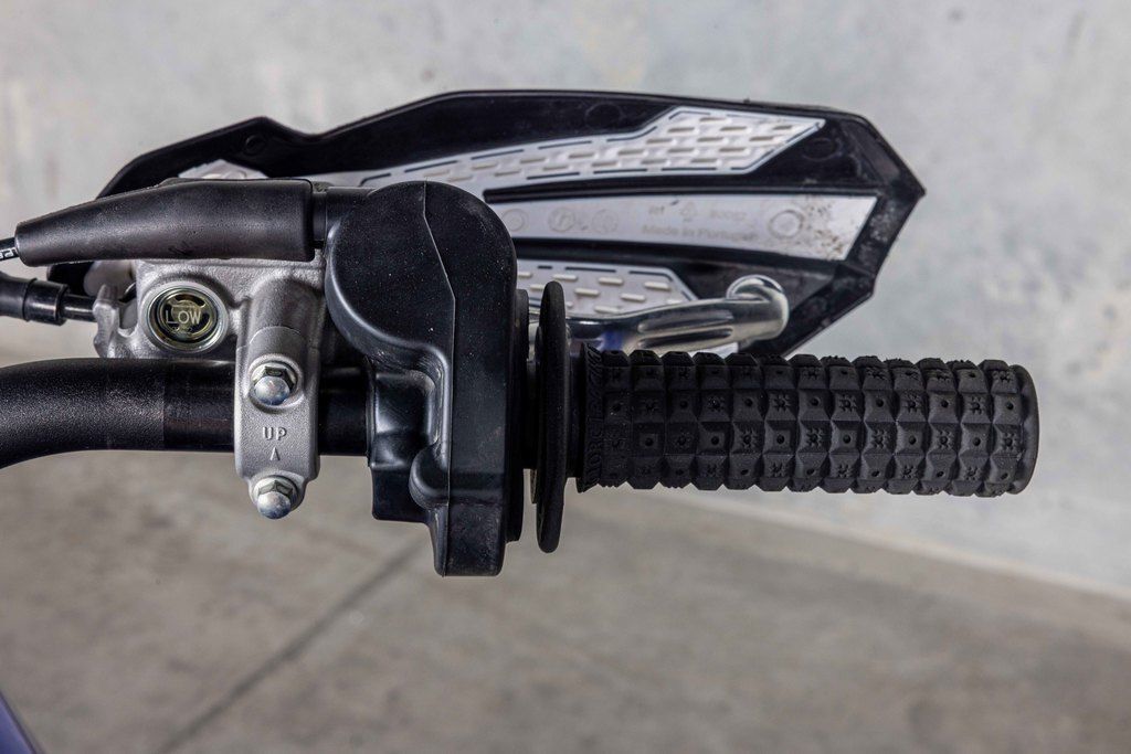 A racy "gripper"-type seat and narrow fuel tank combined with a tapered aluminum handlebar and adjustable mounts create greater freedom of movement and more comfortable ergonomics for riders.