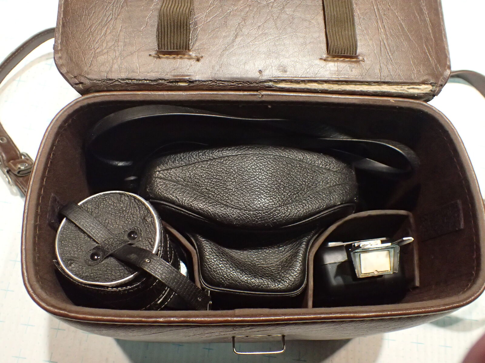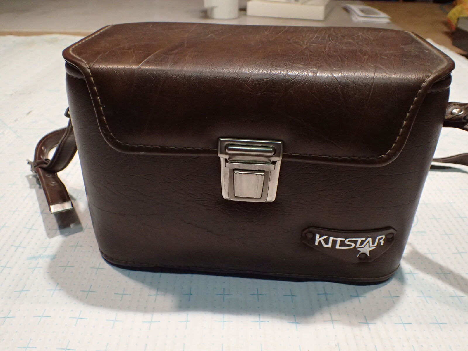 *Leather/felt lined 3 compartment hard shell camera bag w/shoulder strap