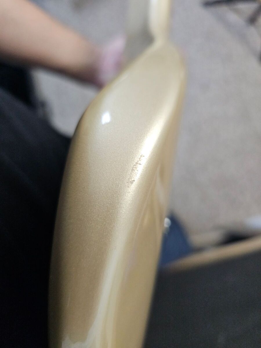 The previous owner drilled a hole for a strap button to play left handed. Minor scuffs and scratches as shown in the pictures.
