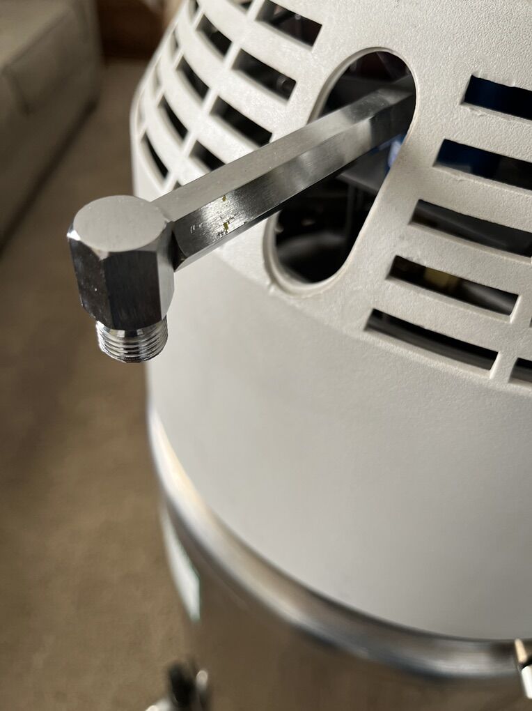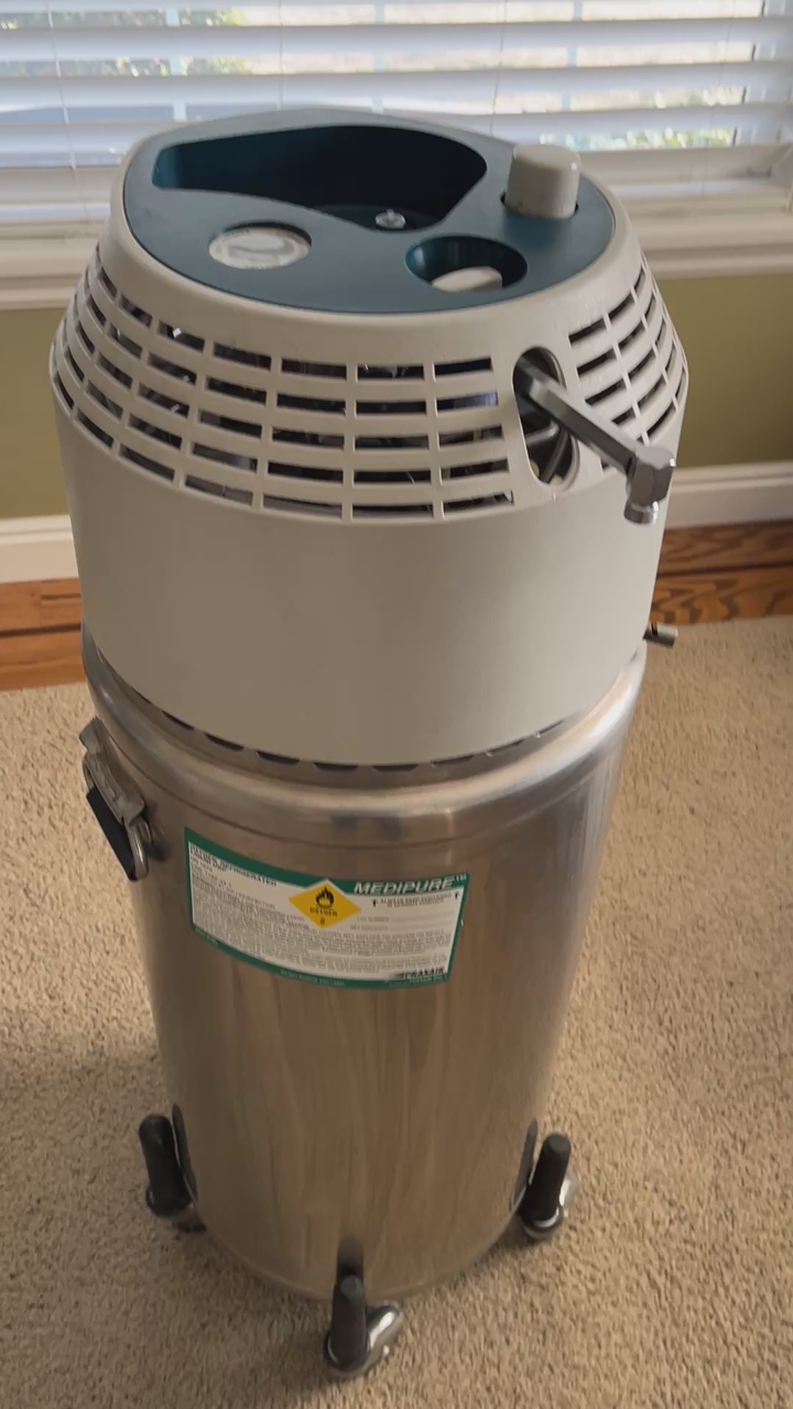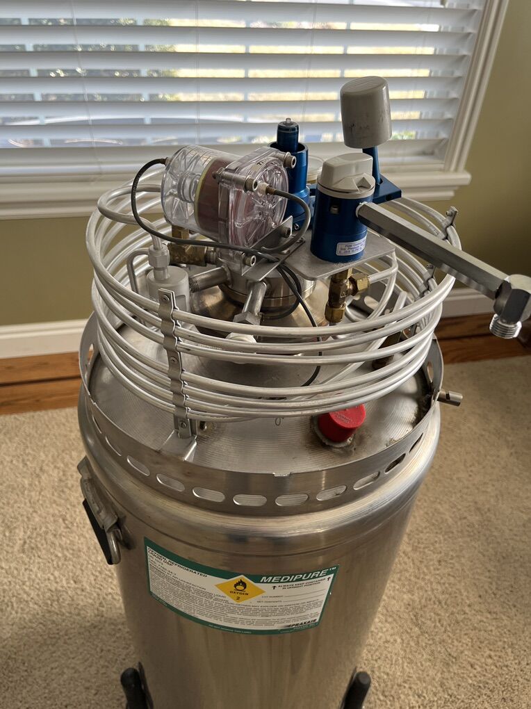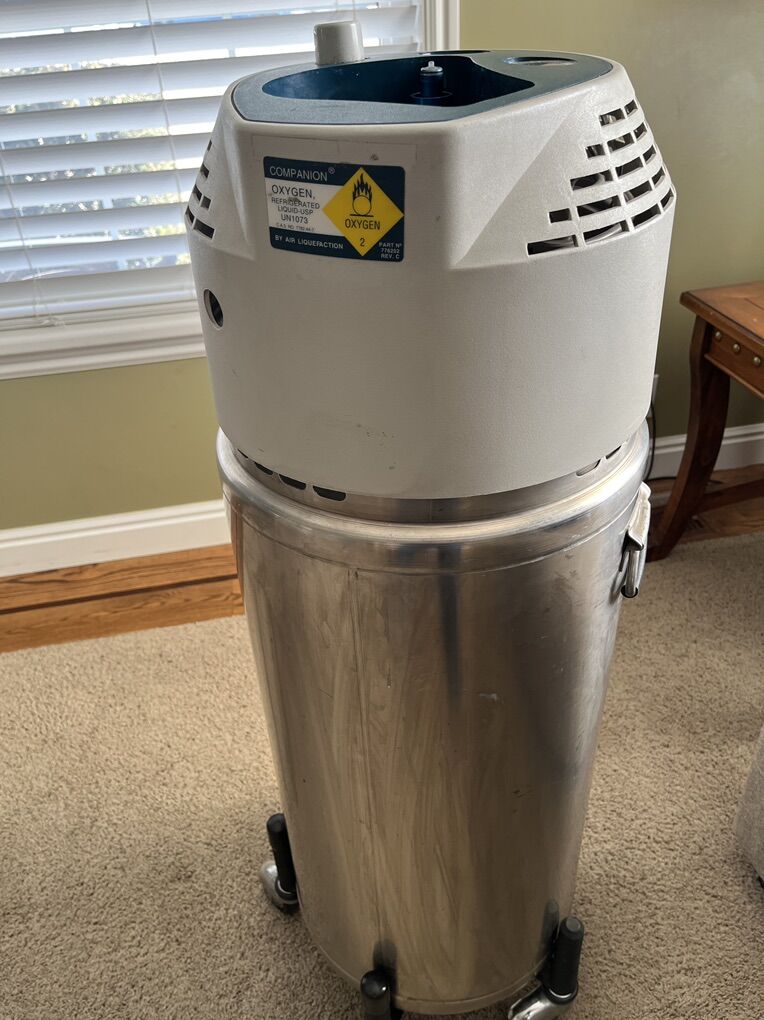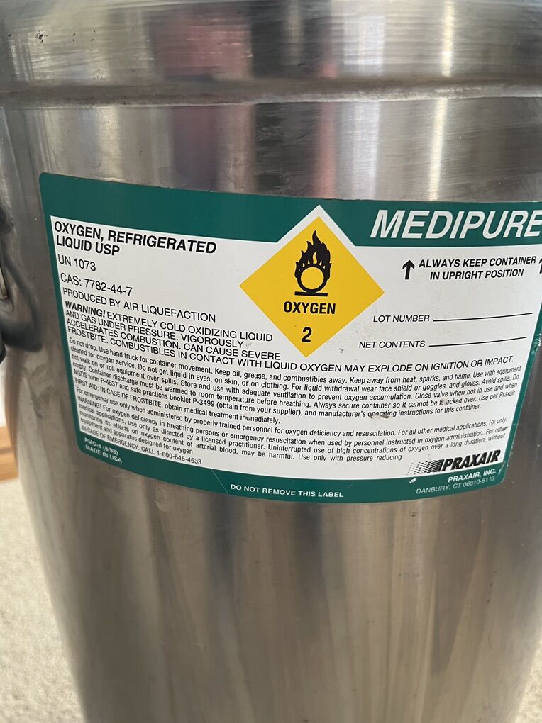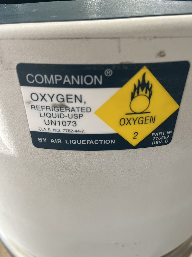 This is a 41 L liquid oxygen tank from a working clinic that is no longer needed. It is in good shape with no dents. It also comes with a rolling rack that runs smoothly. There is a video showing more details.