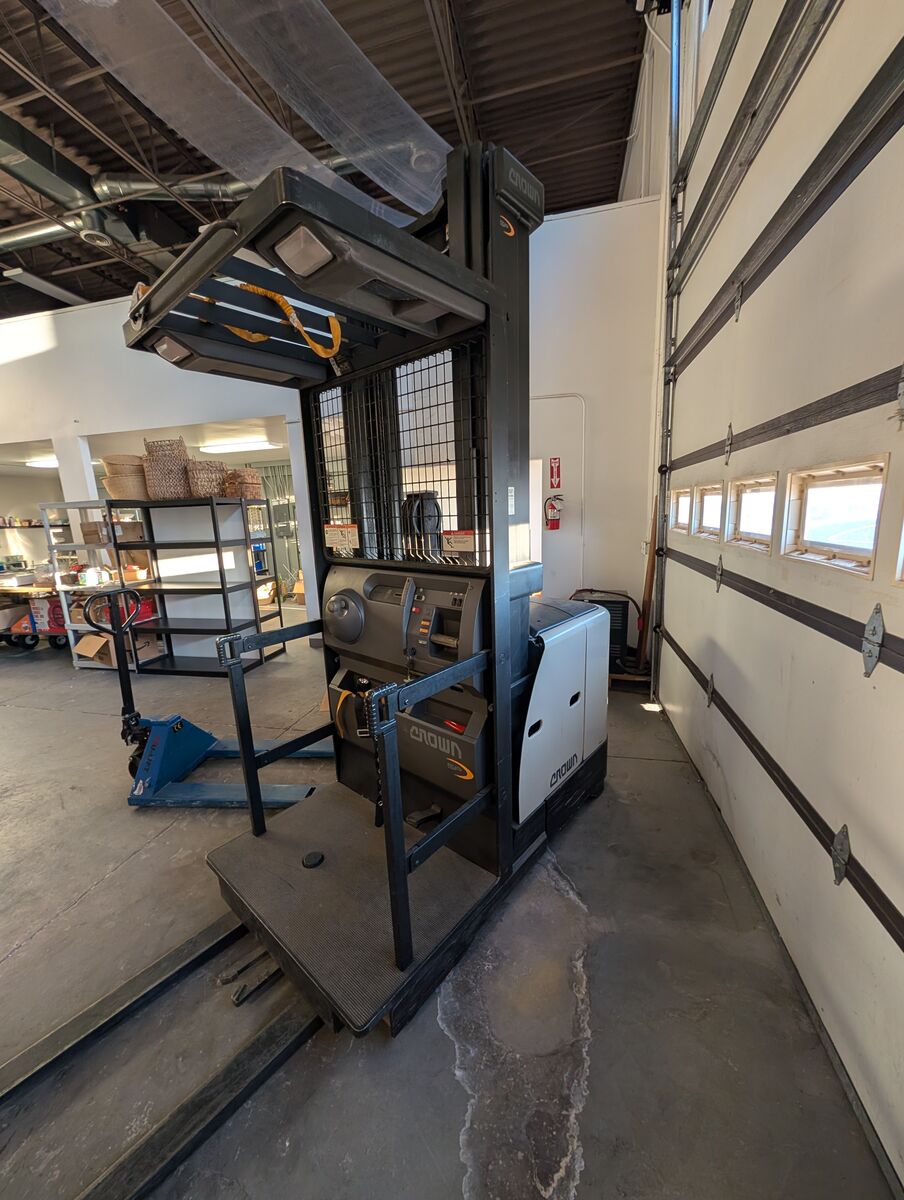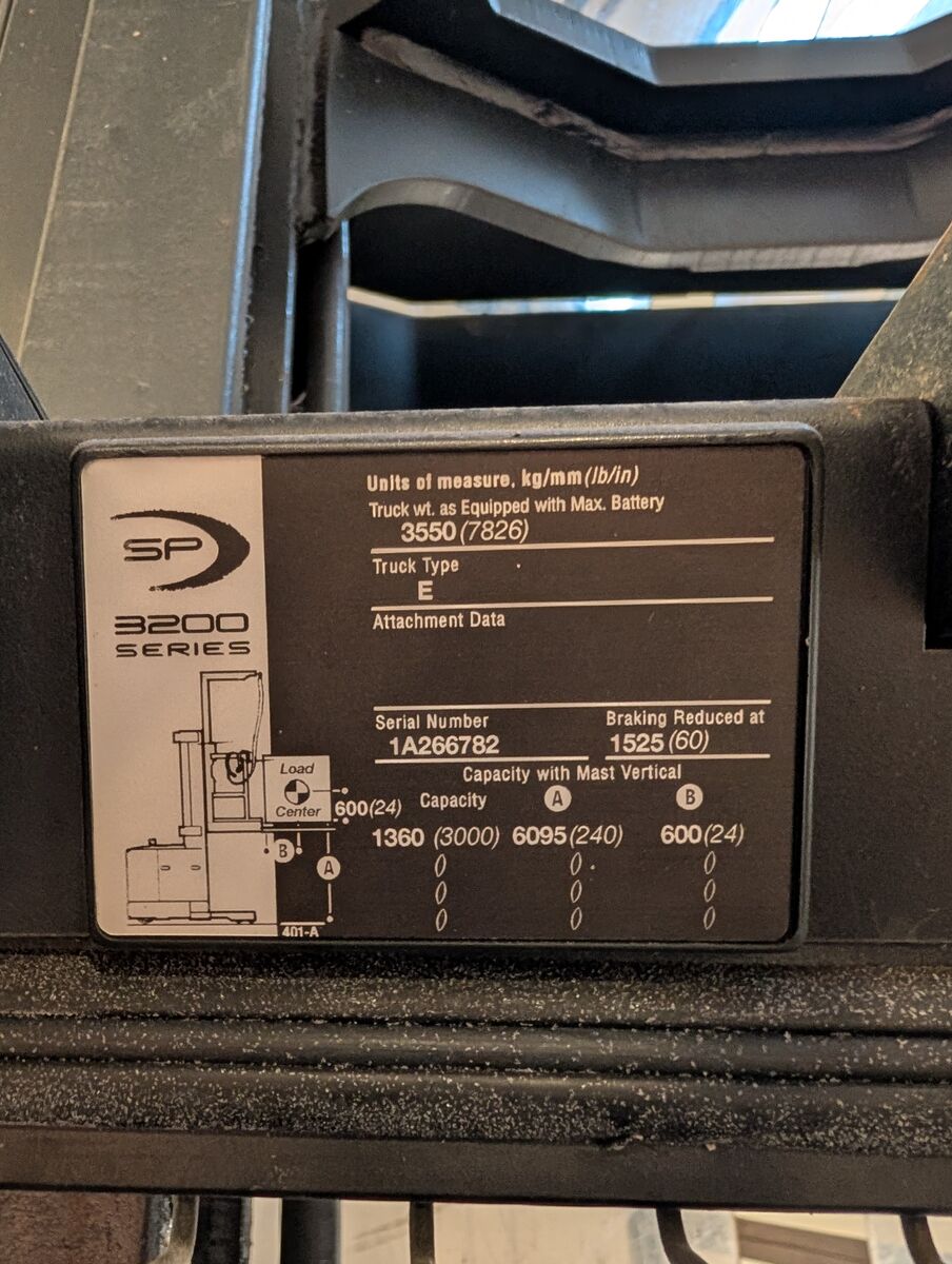 Works great! Recent tune-up from Crown Lift Trucks ($3933.23 invoice available). Low hours! (3190 hours) Pickup only. Selling as no longer needed for our business. Will consider all offers. Douglas Legacy Gold industrial battery charger, Model No DLG1B12-865 may be included based on offer. Model Number: SP3200 Manufacturer: Crown Type: Forklift Subtype: Electric Order Picker Fuel Type Used: Electric Power Source: Electric Motor Battery Capacity: Varies (typically around 24V or 36V options) Performance: Drive Speed: Up to 6.5 miles per hour (unloaded) Lift Capacity: Up to 3,000 lbs Dimensions: Overall Length: Approximately 119 inches (varies with configuration) Overall Width: Around 42 inches Height to Top of Overhead Guard: Approximately 89 inches Operator Area: Ergonomic Design Adjustable Controls Integrated Display for Diagnostics Safety Features: Control Handle with Emergency Reverse Button Automatic Parking Brake Wheels and Tires: Number of Wheels: 4 Tire Type: Polyurethane Additional Features: Integrated Charger LED Lighting Additional info about this model: https://ecseco.com/wp-content/uploads/2013/03/Crown-SP3200-Literature.pdf