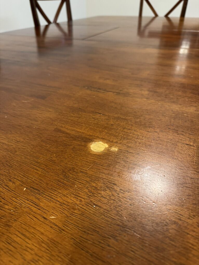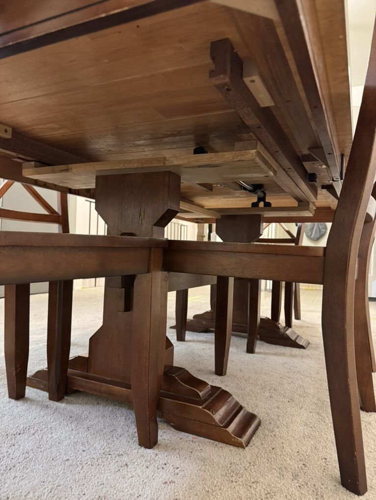 ZelleTable with 6 matching chairs. Hidden leaf. Picture shows in larger configuration, but it shortens by 2 feet and leaf stores inside the table. Some normal wear but good condition overall