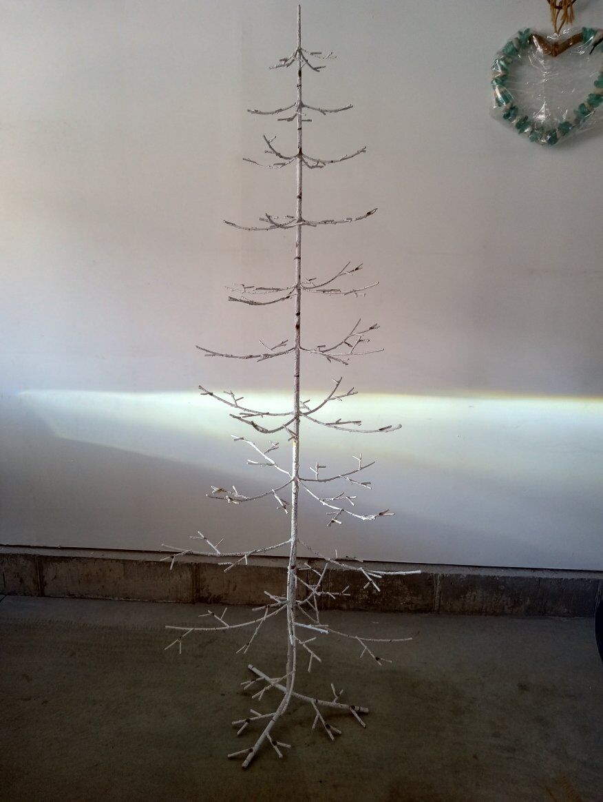 White painted metal tree. Comes in about 5 pieces to assemble. Perfect for weddings, events, or holidays. Approximately 6 feet tall