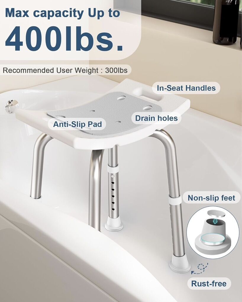 PayPal400lbs Durable Shower ChairHOMLAND bath chair made with reinforced aluminum alloy frames, provided max strength up to 400LBs. Recommended user weight 300lbs. Bath bench dimensions: Width: 17 Inches x Length: 10.5 Inches Non-Slip Rubber FeetWide, skid-resistant feet provide secure attachment to tub or shower floors, ensuring safety for elderly adults during bath time. Stainless steel washers-reinforced feet stable and never worry about rust stains Heigh AdjustableAdjustable seat height with 1” increments to ensure that it is adaptable and fit in any bathrooms. With a seat range from 14 inches to 19 inches, users of all sizes can enjoy optimal comfort and accessibility Advanced FeaturesComes with 1) a bath sponge: with soft nylon to gently clean and effectively wash skin. 2): A clip holder for easy placement of showerhead. 3) an Soft anti-slip cushion: prevents seniors from slipping off the stool while bathing Tool-Free AssemblyLightweight and portable design makes it easily lift in daily use. It comes with a step-by-step manual ensuring hassle-free setup of your new shower chair USA-Based Support & SolutionChoose HOMLAND US-based customer support for worry-free purchasing and after-sales support. If you're not satisfied with your purchase, feel free to contact our after-sales team for lifetime free technical support