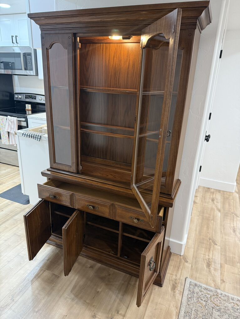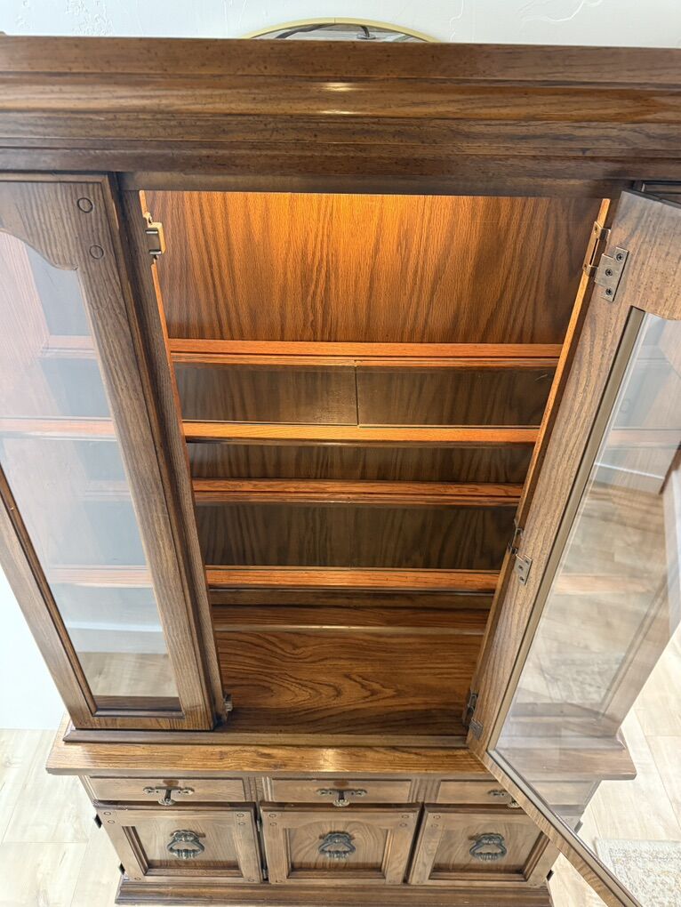 VenmoBeautiful vintage Broyhill Oakcrest china cabinet made from solid wood with a rich, warm finish. Upper cabinet features glass doors, adjustable shelves, and an interior light, perfect for displaying dishes, glassware, or collectibles. The lower cabinet offers generous storage with three drawers and three cabinet doors.