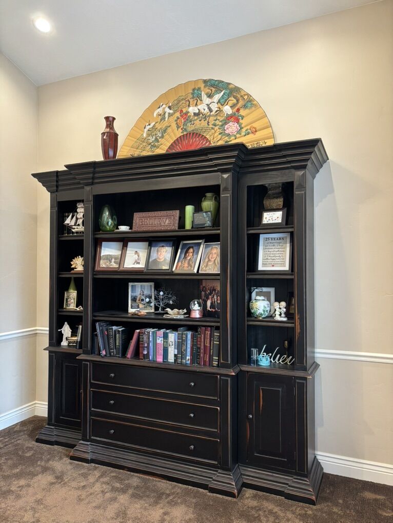 VenmoThis bookcase comes in three sections. Total dimensions: 98.5” (8 ft 2 in) tall 100” (8 ft 4 in) wide 23” (center piece) deep 17” (two side pieces) deep Pick up in Lehi