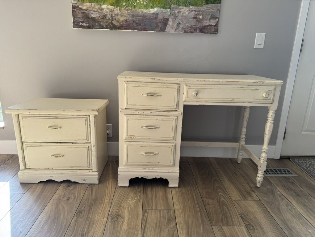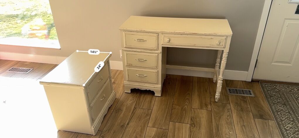 VenmoCharming distressed-finish desk with matching side table/nightstand. Classic farmhouse / shabby-chic style with intentional wear for character. Appears to be solid wood and is sturdy and functional.
