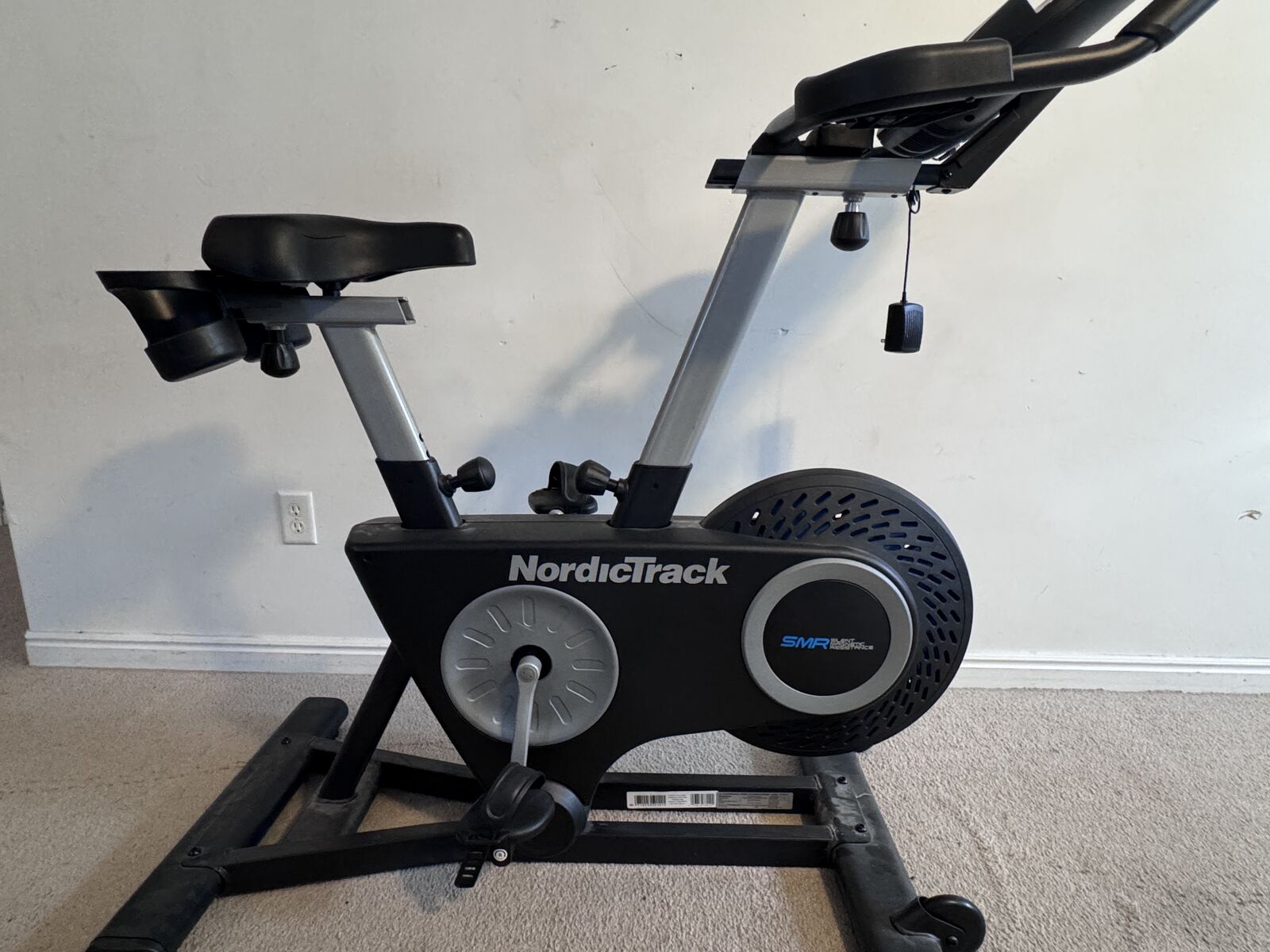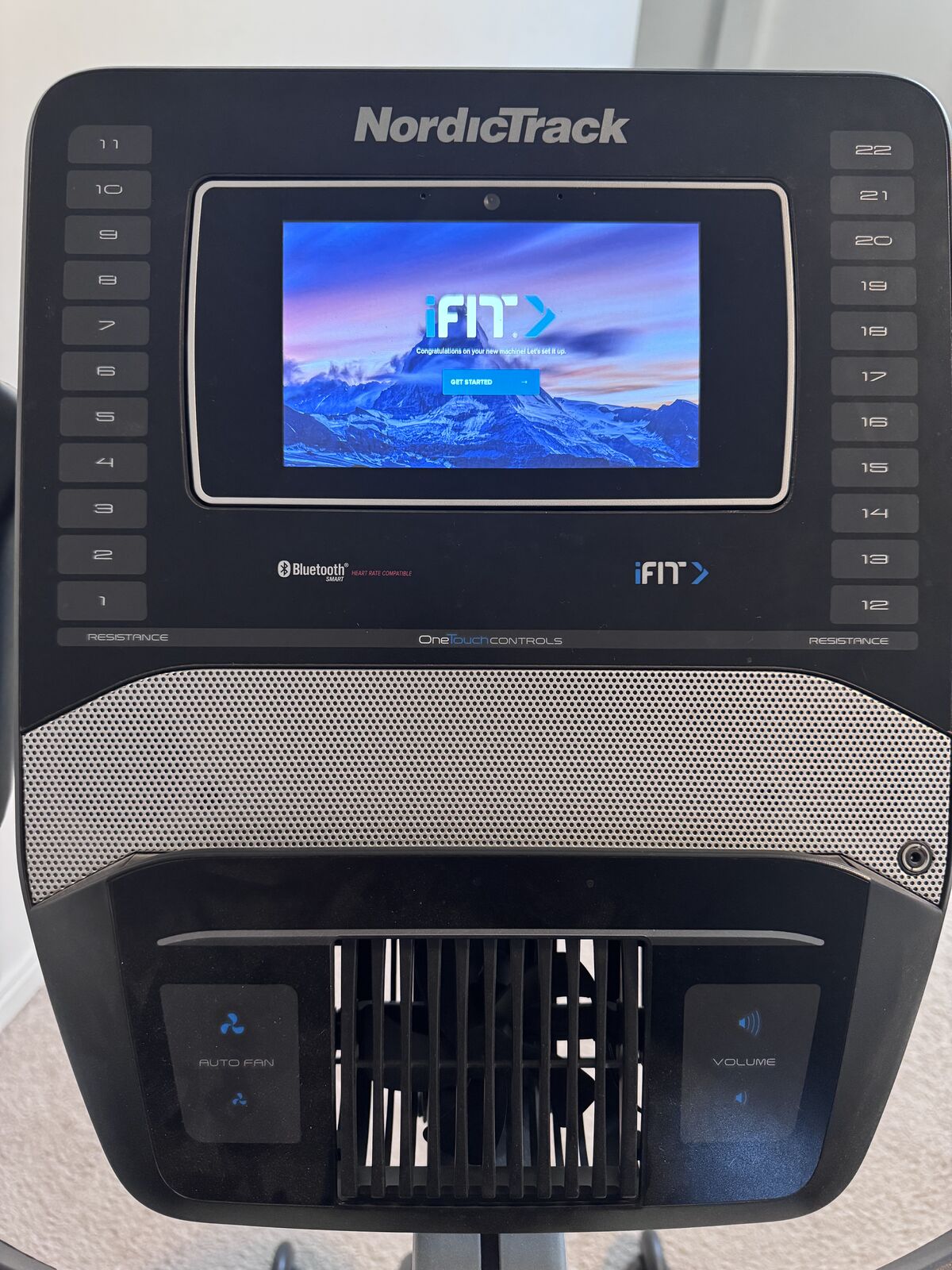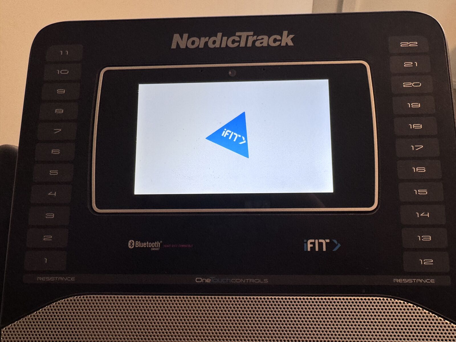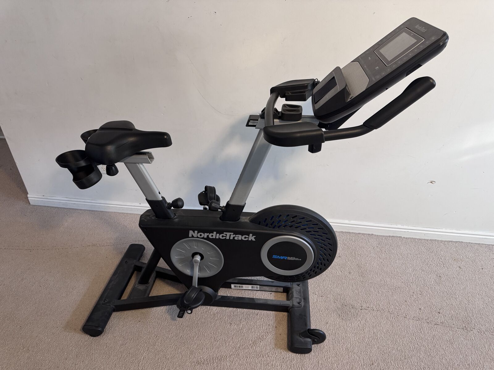 Indoor cycling bike featuring a 7-inch interactive HD touchscreen, 22 levels of SMR™ Silent Magnetic Resistance. It offers Bluetooth capability and a built-in AutoBreeze fan.