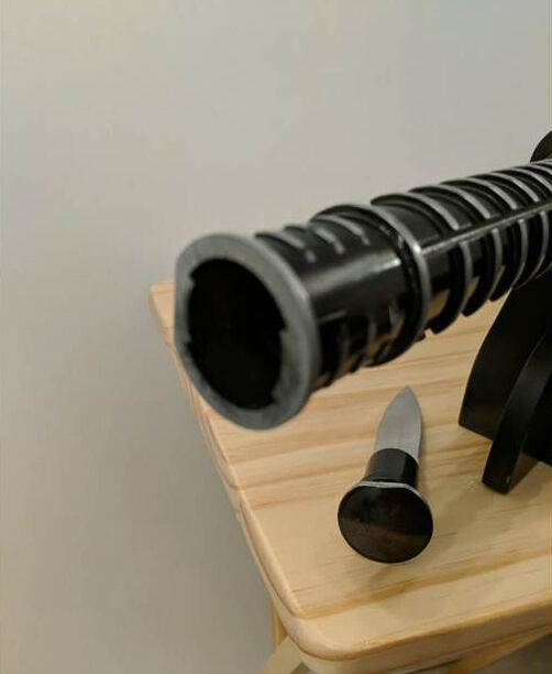 Venmoblade is stainless steel and 27” in length, light saber-ish hilt is 9” in length.