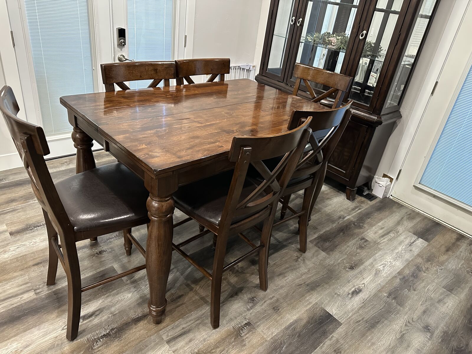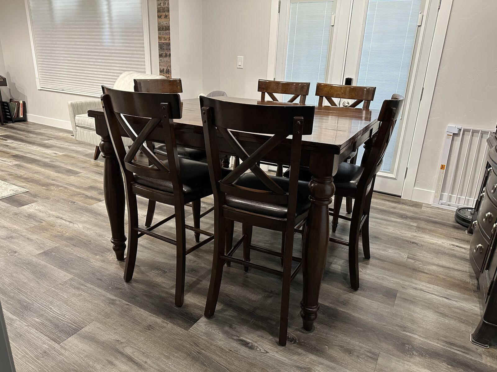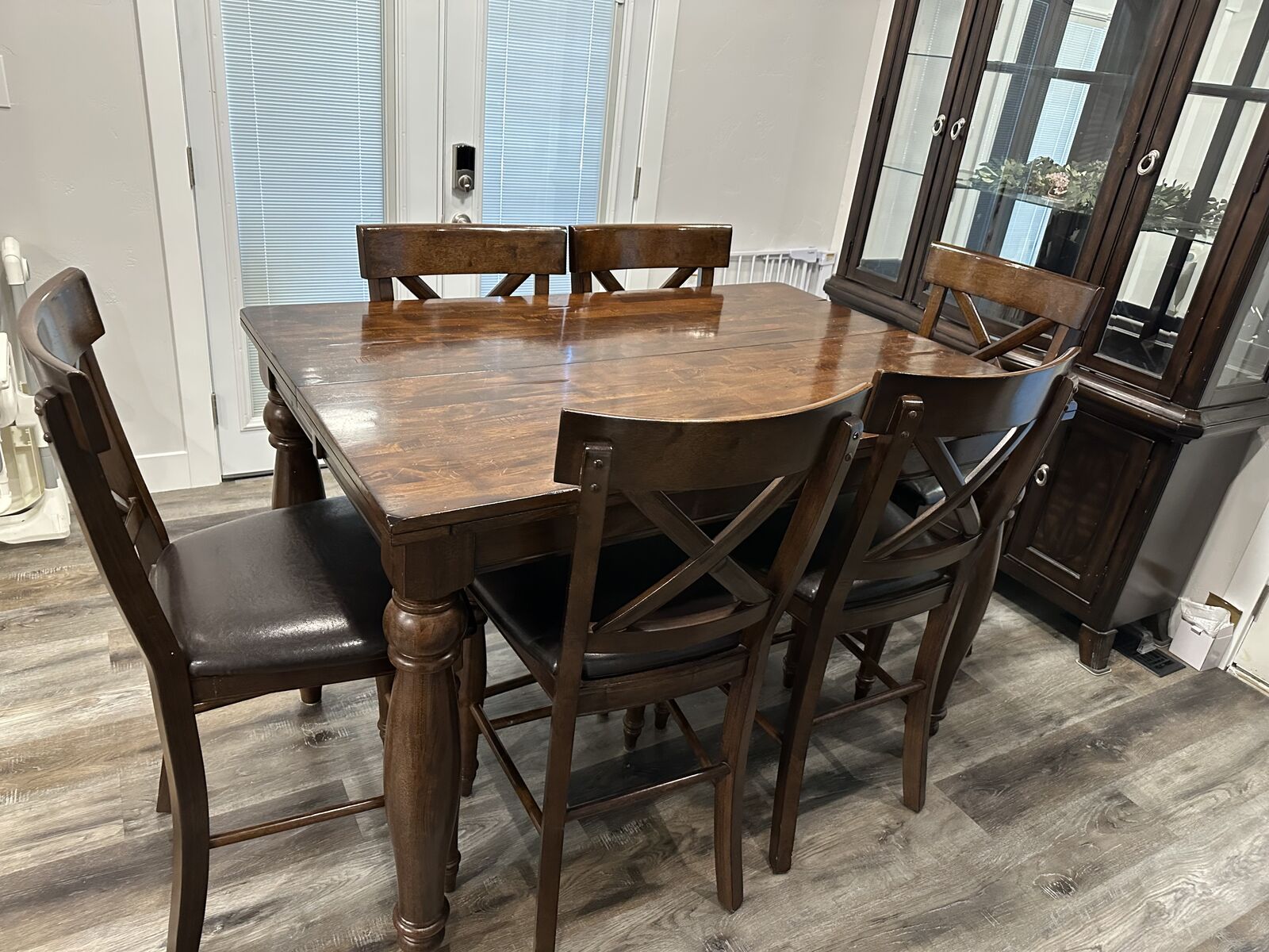 VenmoHigh top dining table that can collapse c we to be smaller or open to be bigger. Includes 8 chairs (one is broken on one of the legs but is repairable). Some scratches on the top of table but overall in really great condition! Asking $450 OBO. You will need a truck or trailer to come get it, or if you want help with delivery, we can discuss that depending on where you are and there will be a small delivery fee.