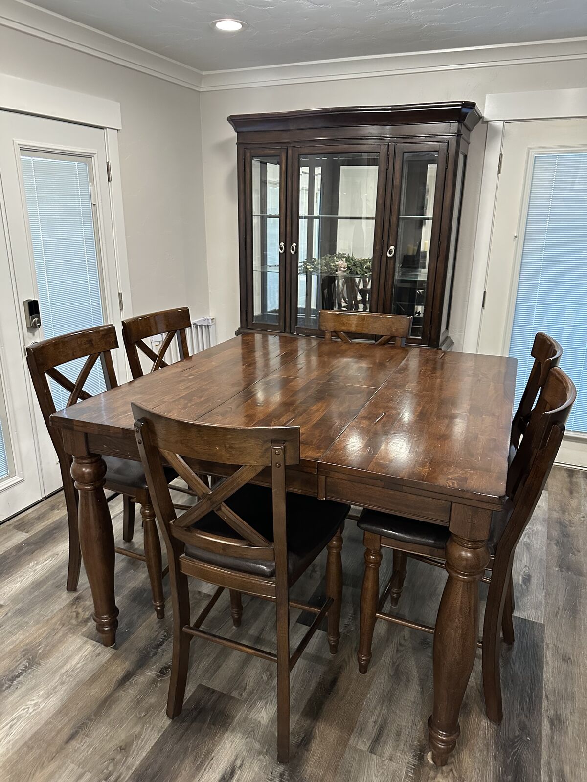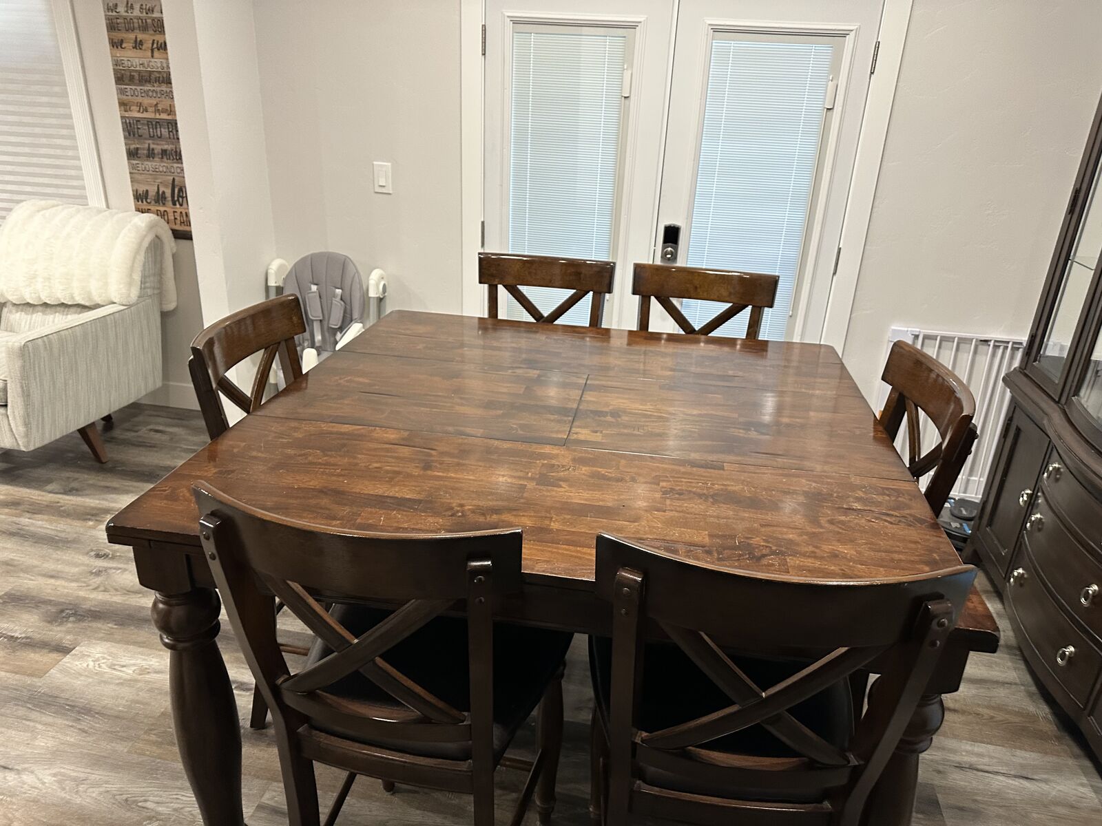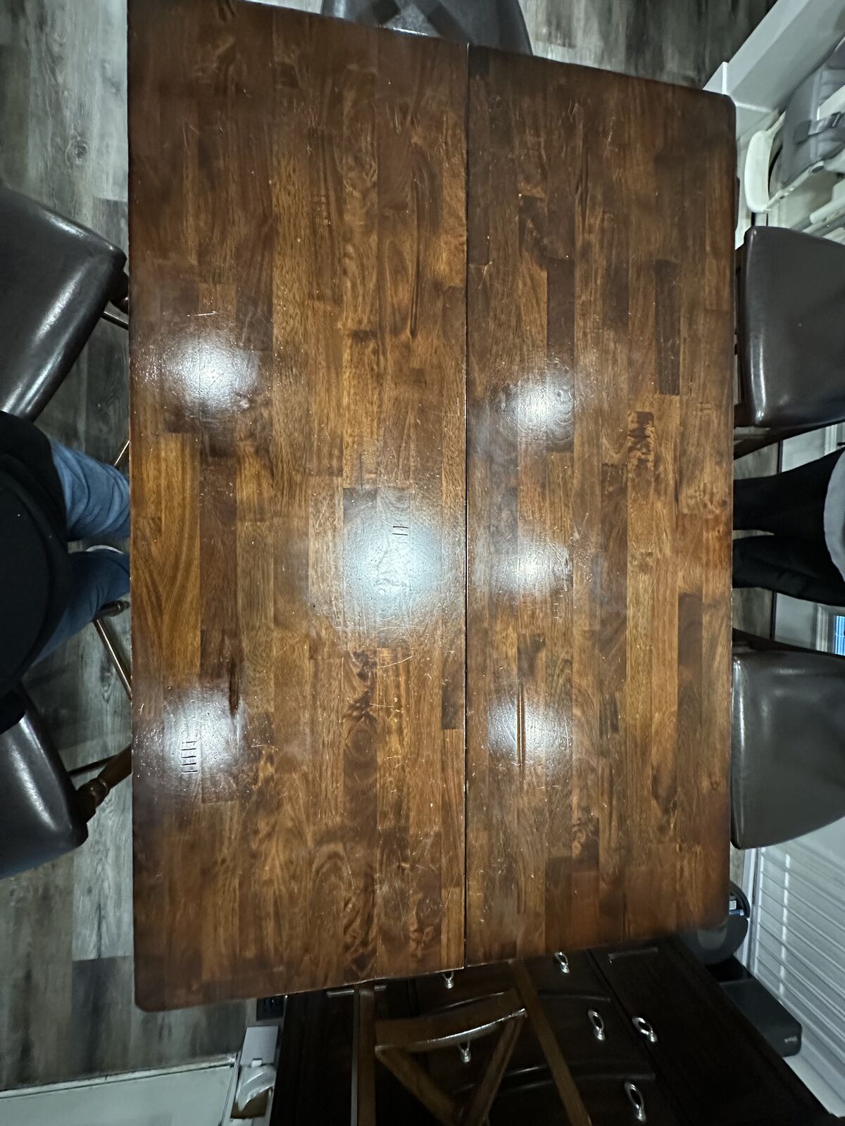 VenmoHigh top dining table that can collapse c we to be smaller or open to be bigger. Includes 8 chairs (one is broken on one of the legs but is repairable). Some scratches on the top of table but overall in really great condition! Asking $450 OBO. You will need a truck or trailer to come get it, or if you want help with delivery, we can discuss that depending on where you are and there will be a small delivery fee.