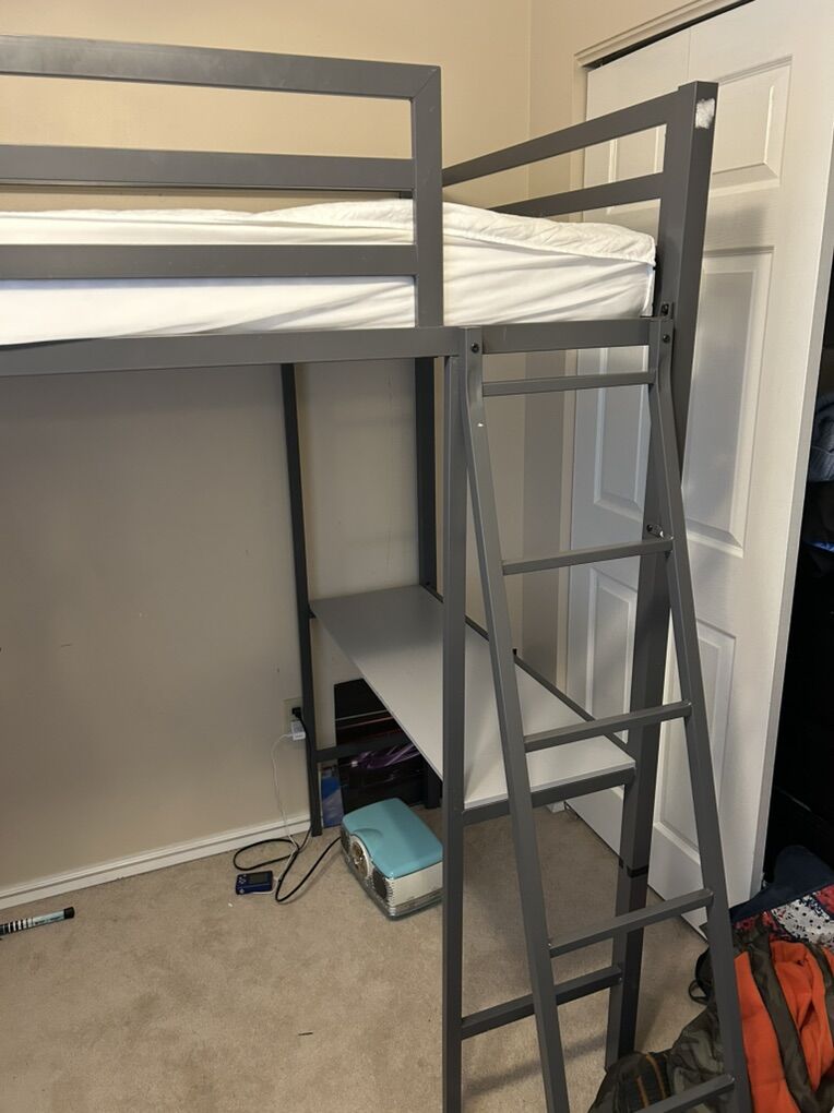VenmoMetal twin loft bed. Three shelves, one desk under. 200 OBO