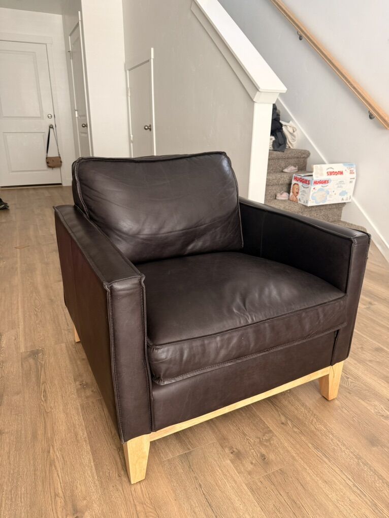 VenmoSelling my black genuine leather accent chair that I originally bought from DownEast. Really sad to see this go but we have different plans for our space now🥲 MSRP is $2249 I bought it from Downeast for $1249 Selling for $900 Semi-attached zippered cushions Bottom seat velcros to the chair so it doesn’t slip while you sit 100% Italian full grain leather I also have leather conditioner and cleaner that I used on it that I’ll throw in for free! 34” W x 32” H x 35” D Has natural wear as you would expect from real leather, some scratches and marks. But with leather conditioner, it blends into the piece. No rips or holes. No staining. I can deliver for an extra cost, Message me for pricing to your area.
