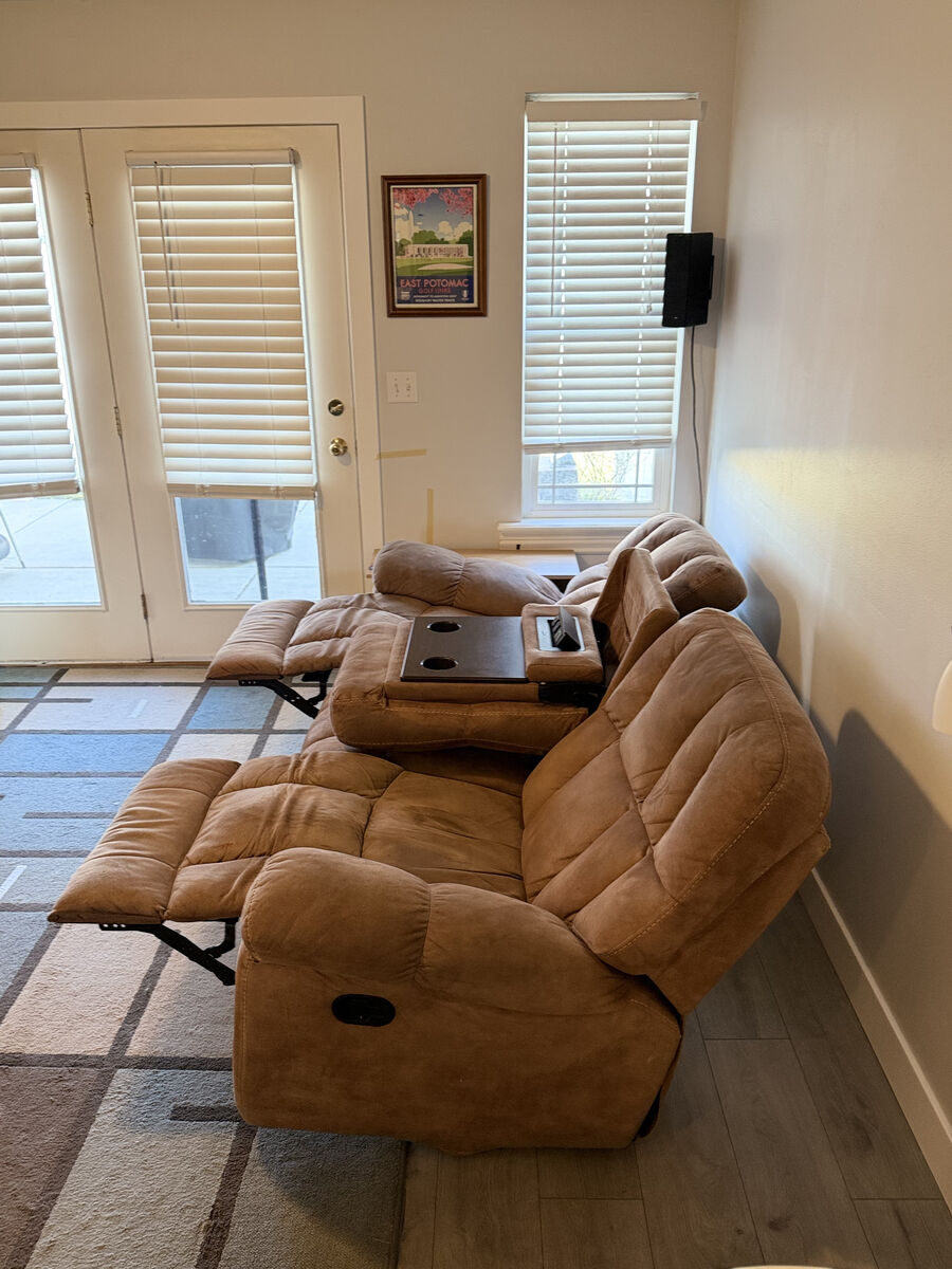 VenmoDual reclining ends with flip-down center console for cupholders, storage, USB charging ports, and standard outlets. Material is faux suede adjacent I think.
