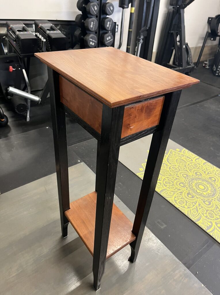 ZellePrice Drop This is a hand crafted cherry and oak side table with drawer. It measures 36” tall, 15” wide and 11.5” deep. The cherry has tiny oil finish and oak was dyed black with India ink and protected with water based polyurethane.