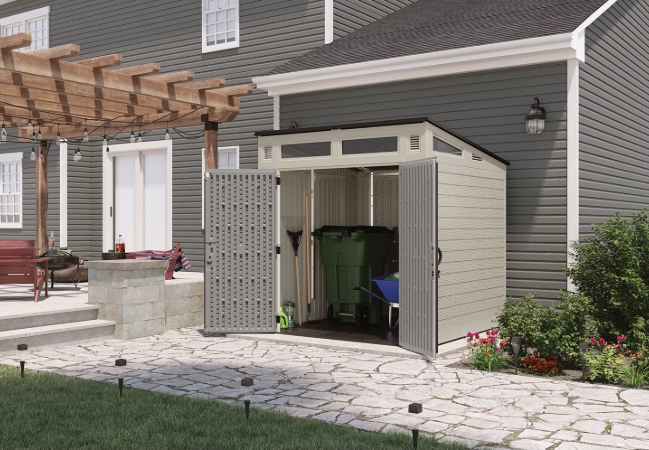 Heavy-Duty Floor and Secure Access The Modernist Storage Shed features a reinforced resin floor engineered to bear heavy loads, including tractors, mowers, and other hefty lawn or outdoor equipment. It comes with sturdy double doors for easy access to your stored items. For added security, the shed is equipped with pad-lockable metal handles (resin handle, metal slide latch). Please note that the lock is not included.