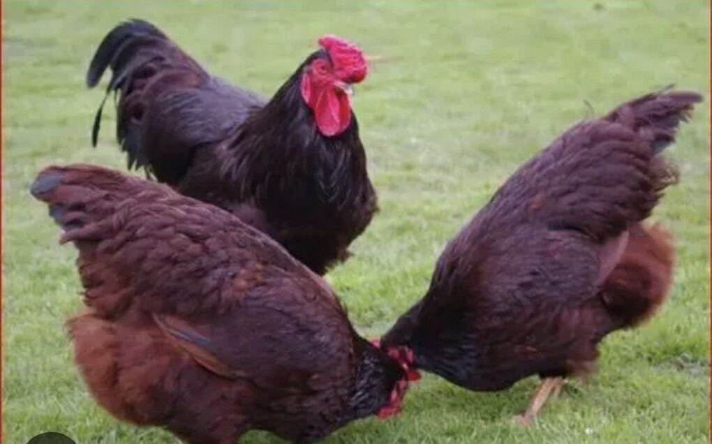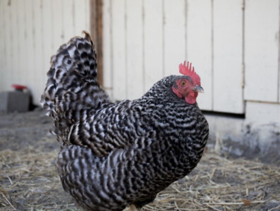 (Red birds that resemble Rhode Island Reds with white feather tips and blotches. Chicks can be sexed at hatch — males hatch yellow, females hatch red.)