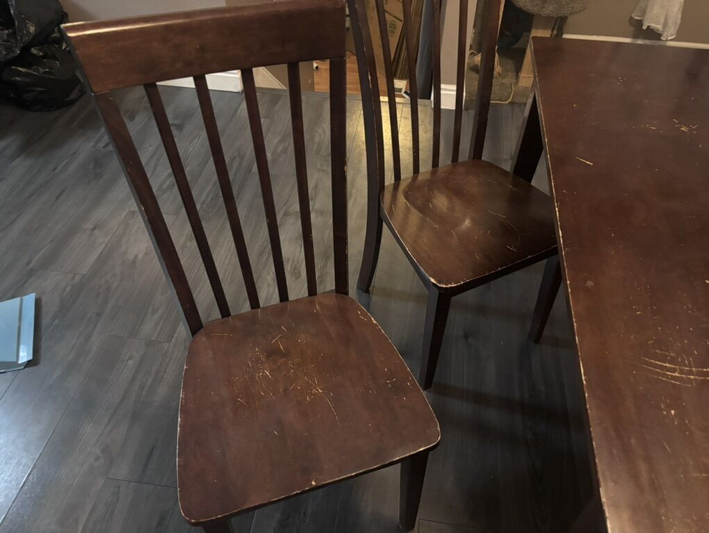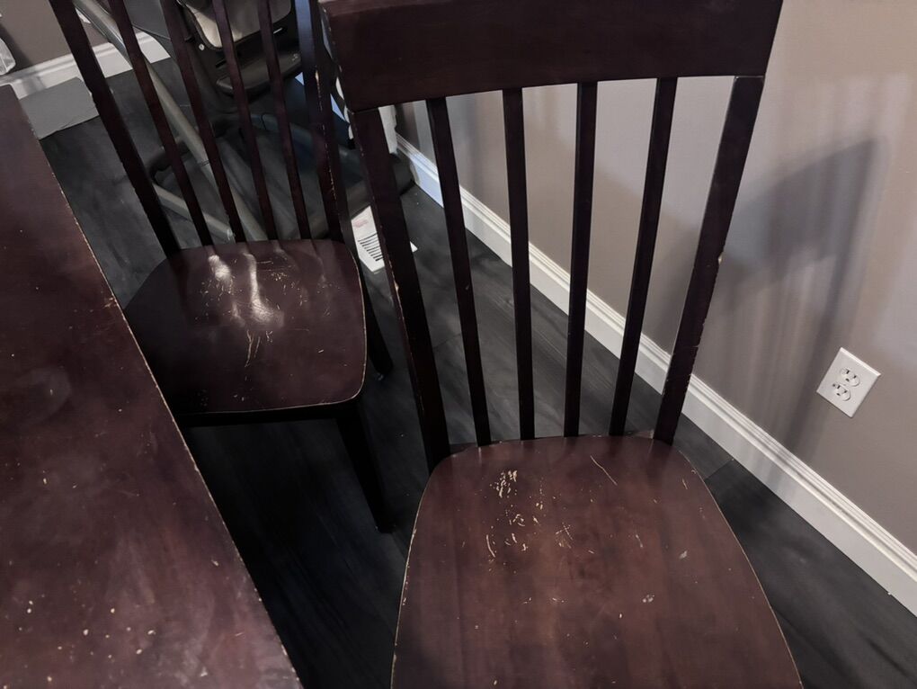 Nothing wrong with table or chairs, they are all super sturdy and still have a ton of life left! Just cosmetic damage but could easily be sanded and refinished!
