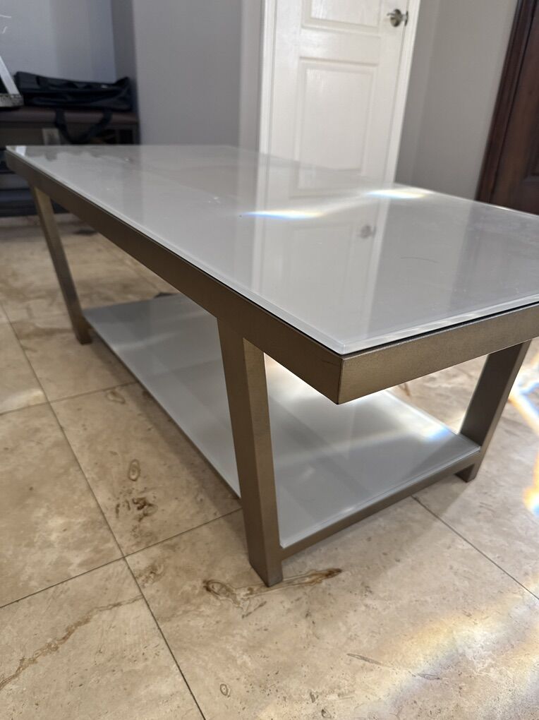 Opaque Glass and gold metal coffee table. Sturdy and great condition.
