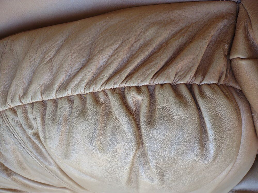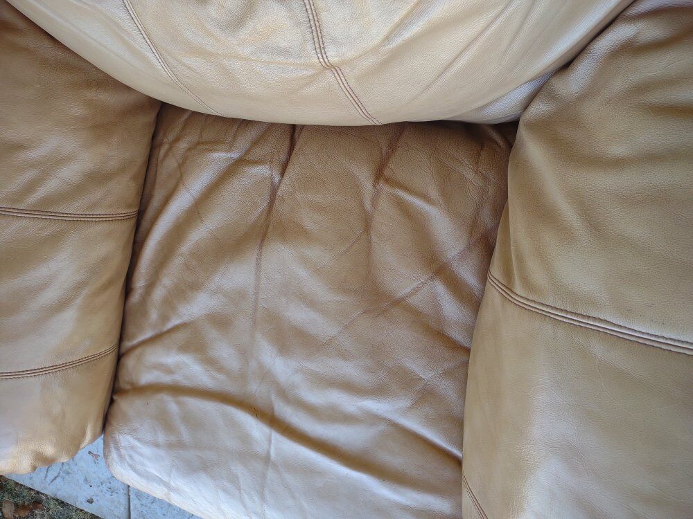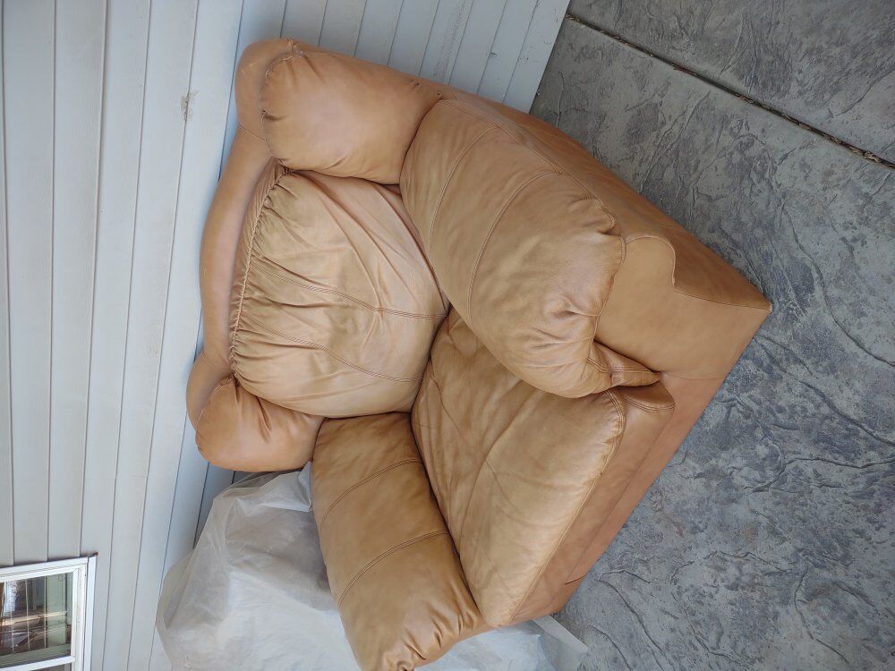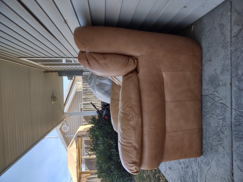 Venmofits one fluffy person or two skinny persons. real leather. spent its life indoors not on this porch. good comfortable seat. $50 obo 51 inches wide. 47 inches deep
