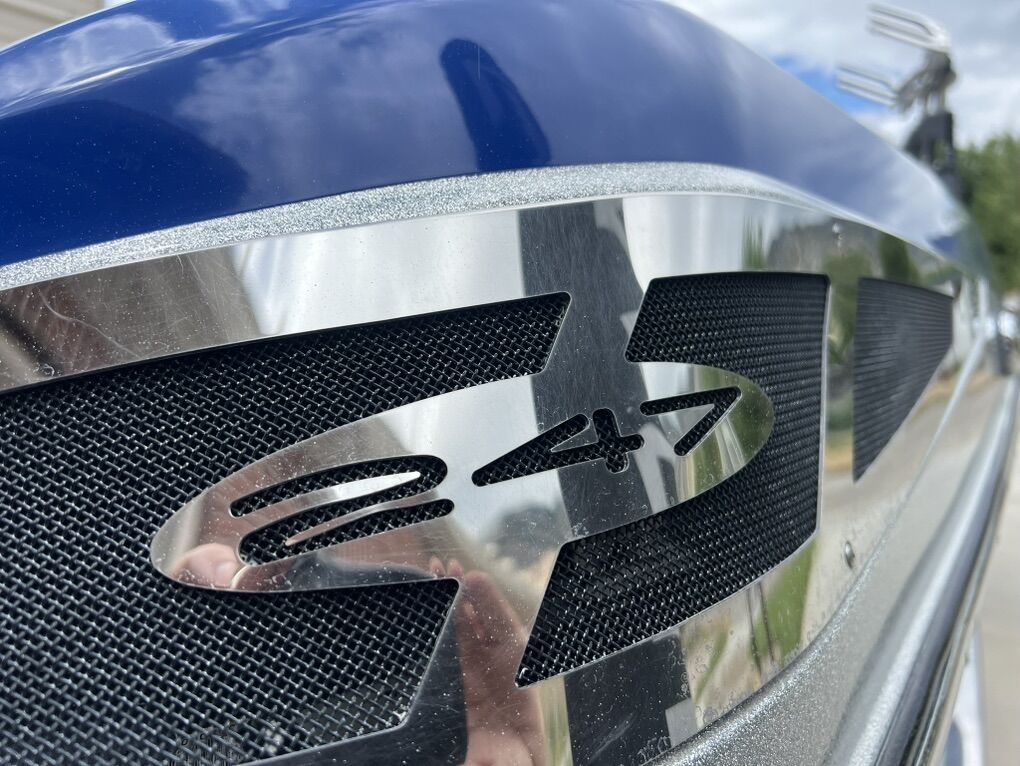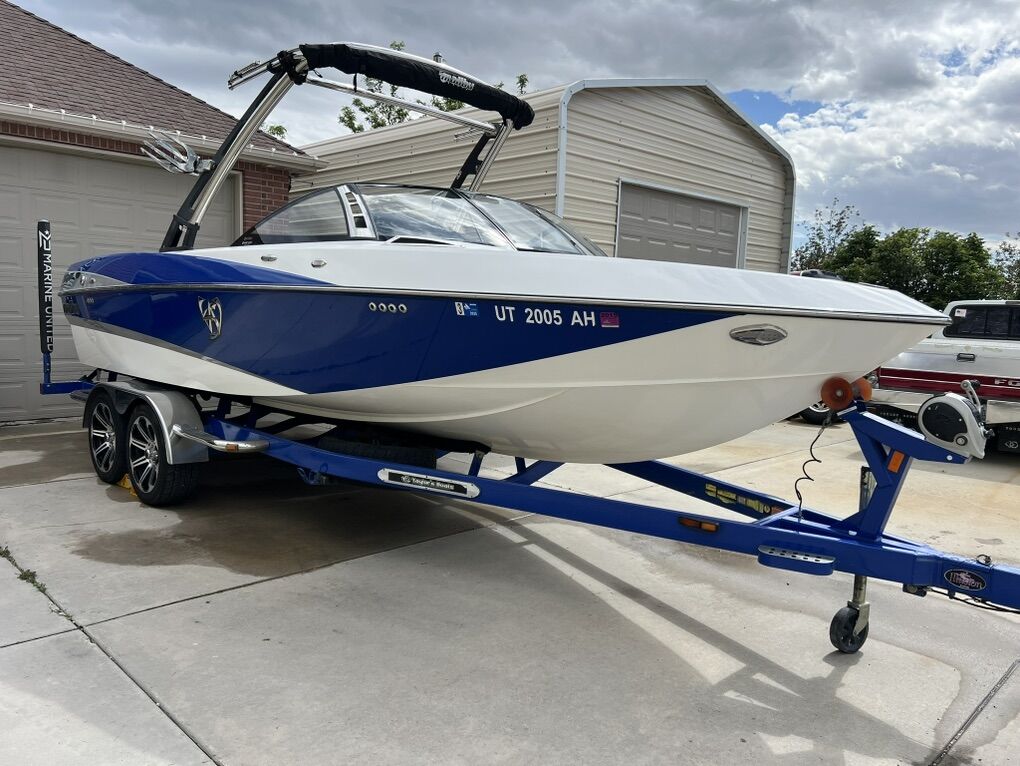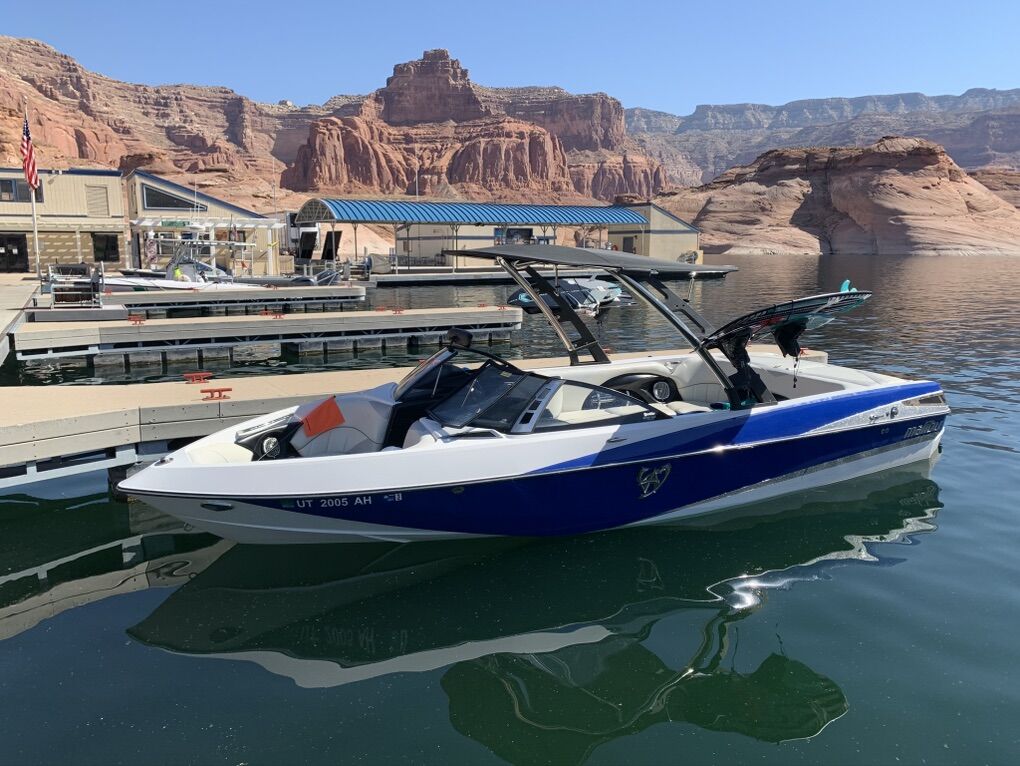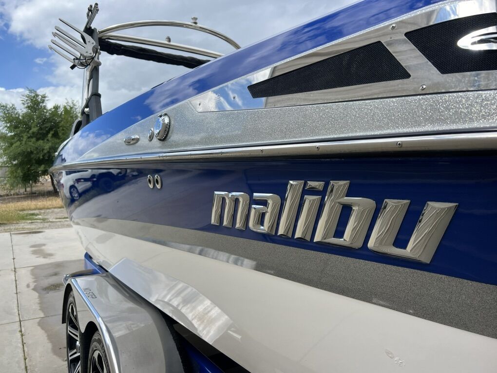 Specs: 24 feet 7 inches 450HP 427/LS3 6.2 V8 Corvette Engine V Drive Shaft Transmission Illusion G3 Tower with Titan Spinner Comb-Fork Racks and Bimini Cover, which all fold in and easily collapse for storage. Malibu SurfGate Power Wedge 1,450lbs HI-FLO Hard-Tank bow, midship, L/R rear ballast 660lbs per side of Custom FIT rear locker ballast plumbed into the factory Plug & Play system. 78 Gallon Fuel Tank 17 Passenger MaliView 6.5” Dash Display System w/Depth Finder Malibu Touch Command System w/ Keyless Start Precision Pro Speed Control (cruise control) Rockford Fosgate Stereo w/12” Subwoofer & Amp Marine Radio Isotta Single Spoke Sport Steering Wheel Flip up Drivers Seat Bulster Cockpit Heater Hot Water Shower Large Swim Platform Pop Up Bow, Docking, Transom Lighting Interior LED Mood Lighting Built In Ice Chest 140 Degree Panoramic Mirror Removable Table Retractable Docking Cleats 2 New Interstate Marine Batteries Pro Mariner Battery Maintainer Lots of under seat storage Malibu Custom Fitted Cover Color Matched Tandem Axle EZLoader Trailer w/Sport Wheels and Fold Away Tongue