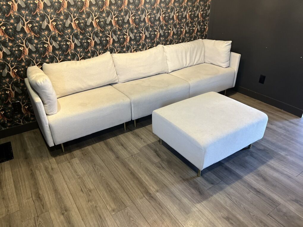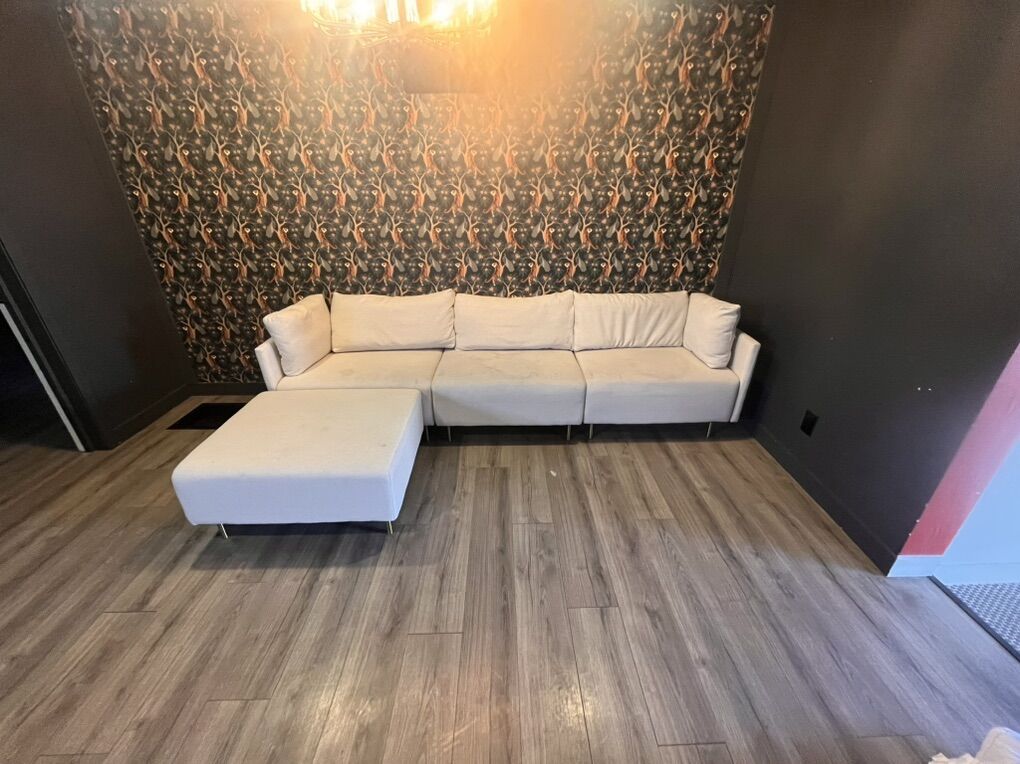 This couch was used in an Airbnb unit so it needs a good cleaning. It’s a little small for adults to lounge on, but it would be great for a kids basement area. The fabric looks like it would clean up nicely.