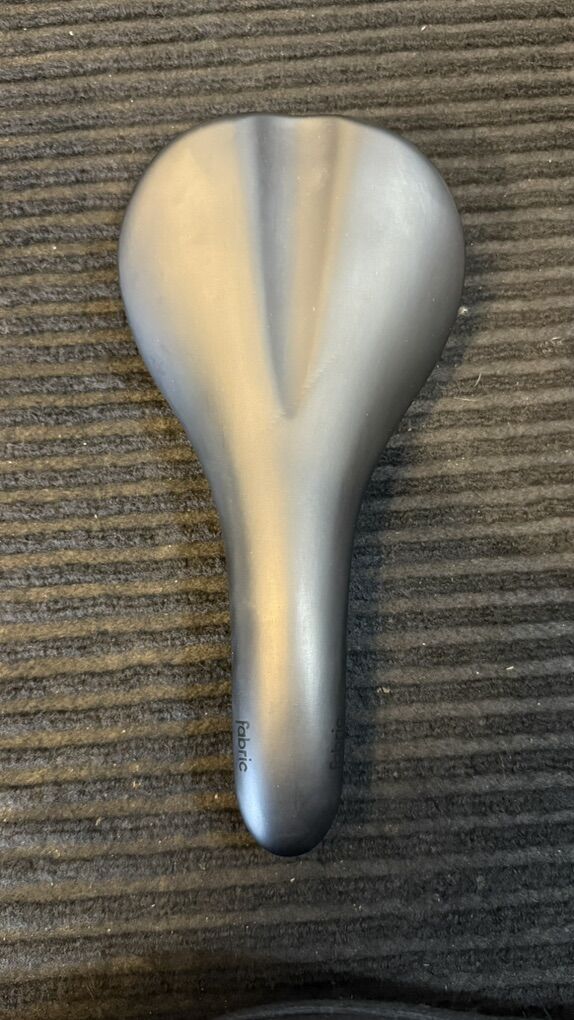 GooglePayCarbon rail Scoop saddle. Sitting width is about 135mm. Shallow size is described by Fabric as “an aggressive fit, for handlebars below the stem.” Medium padding. Mounted but never ridden.