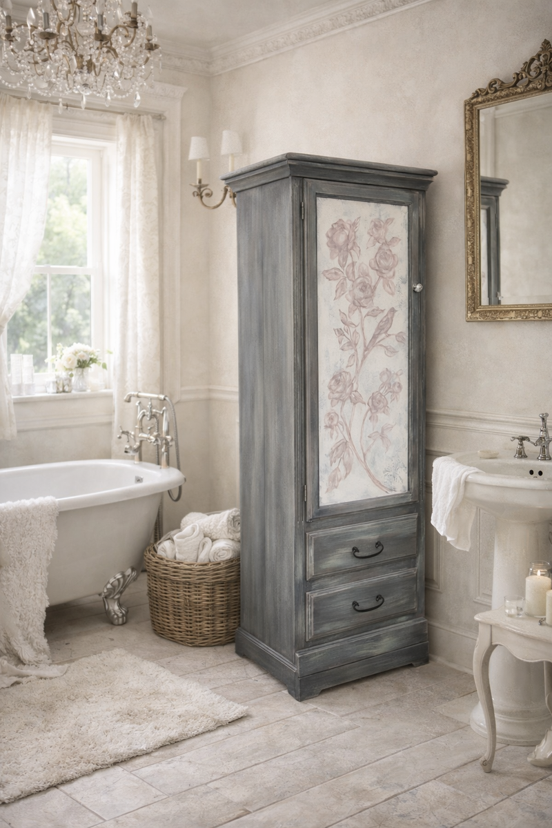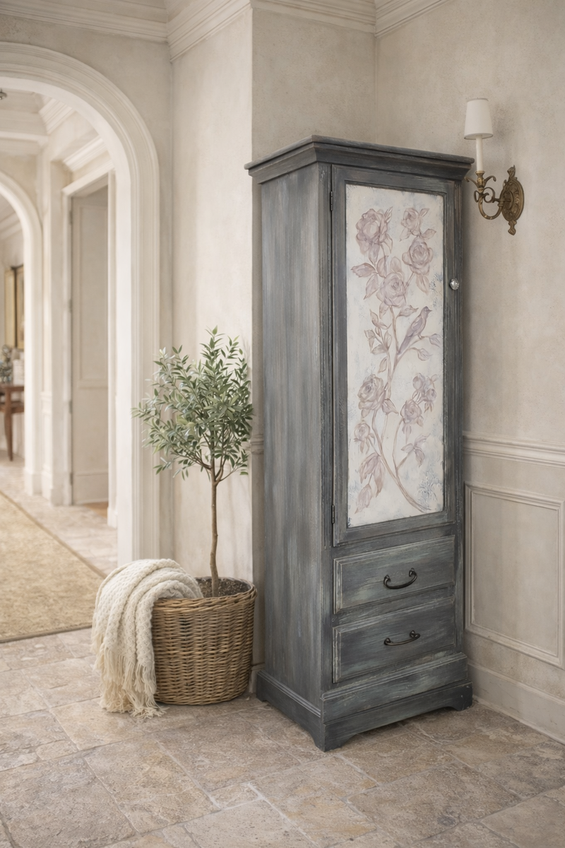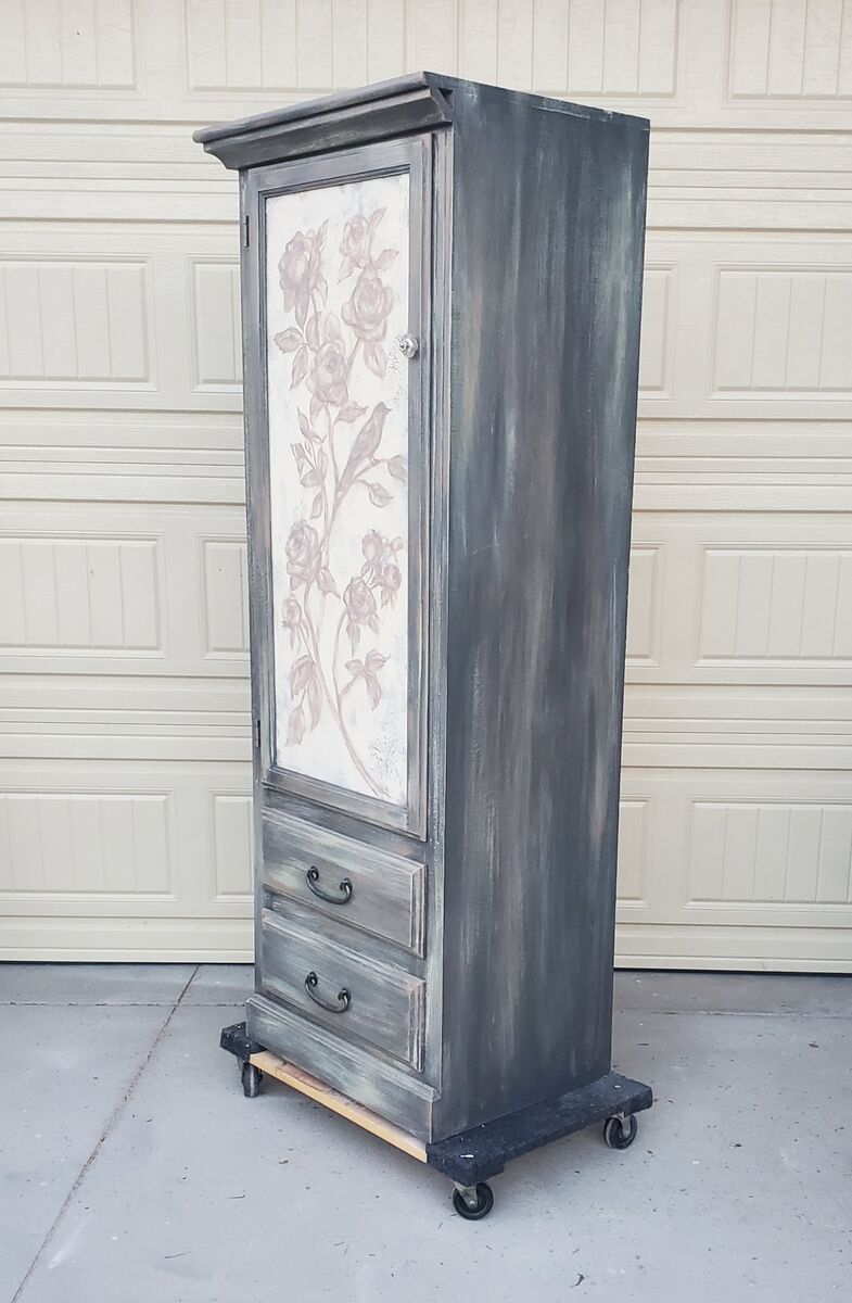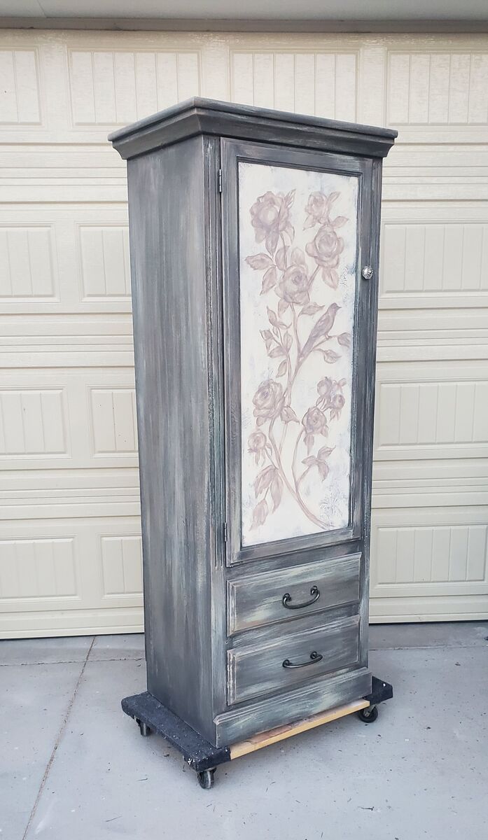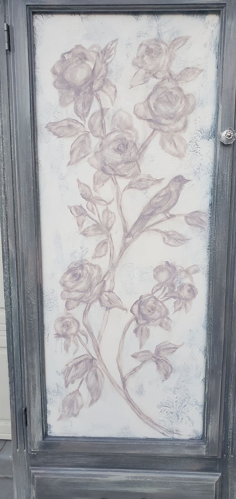 This UNIQUE cabinet has been updated, and made artistic with the handpainted panel of climbing roses and a bird, and faux finish to look like weathered wood of tans, taupes, and greys, and a French Blue interior. It has 3 shelves, and 2 drawers for lots of organized storage. It is lacking crown molding on the right side, so making it ideal to fit against a wall.