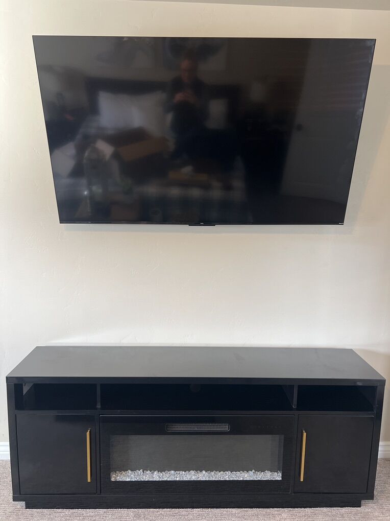 Zelle This electric fireplace TV stand is 69 inches wide, 15 inches deep, and 27 inches high.  The flame is adjustable and can change color. The black finish is slightly glossy which makes it easy to clean. It also functions as a space heater.