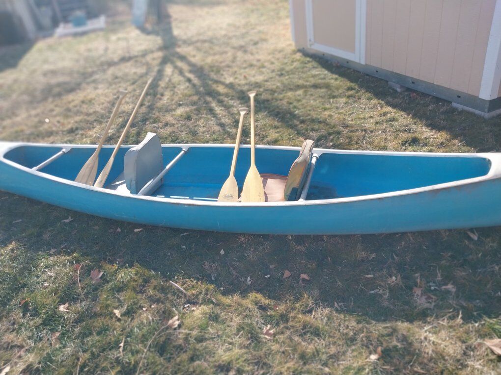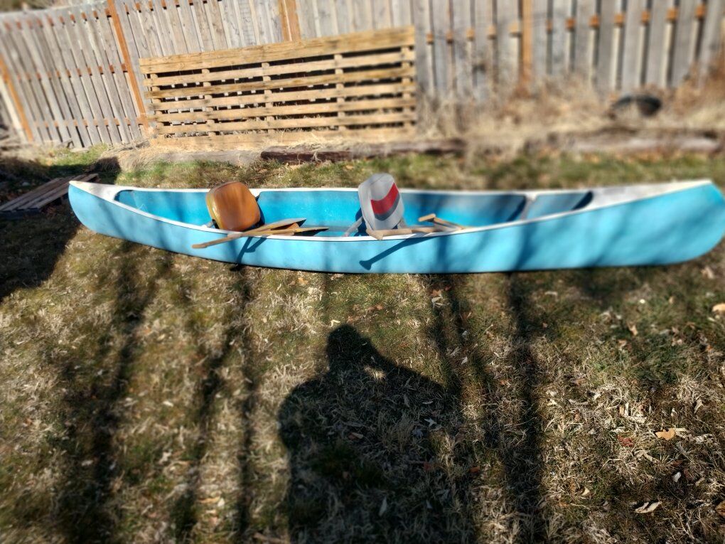 CashApp15' professionally laid fiberglass white water canoe. Front and rear bulkheads are sealed so it will float. Comes with 2 boat seats and 2 long a 2 short paddles.