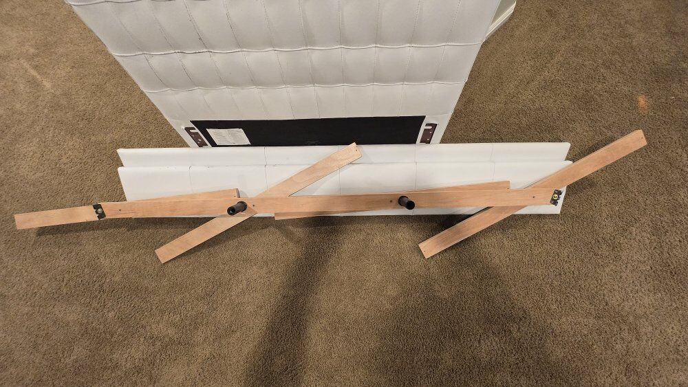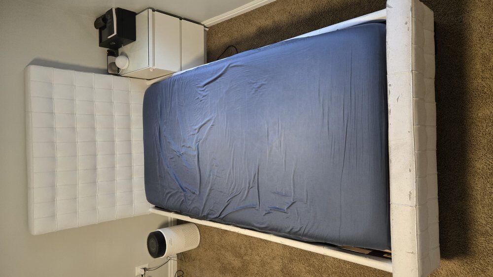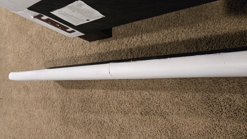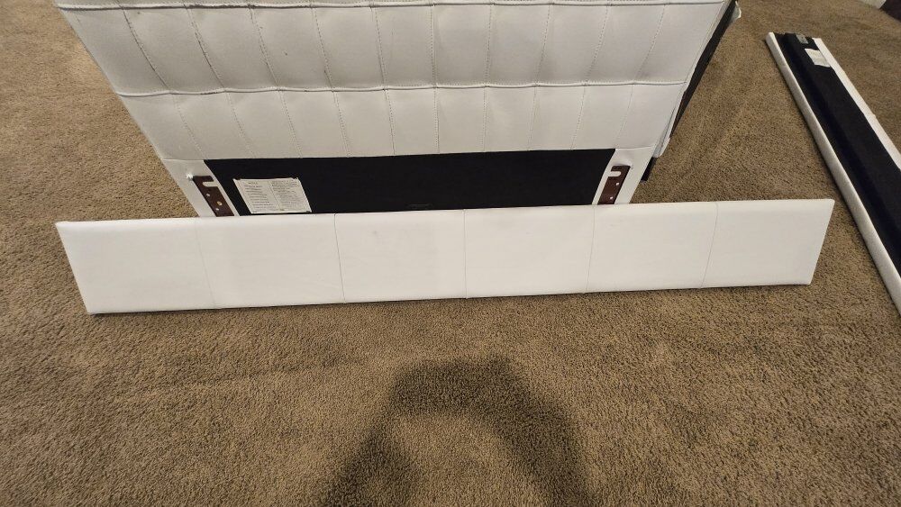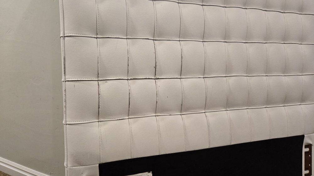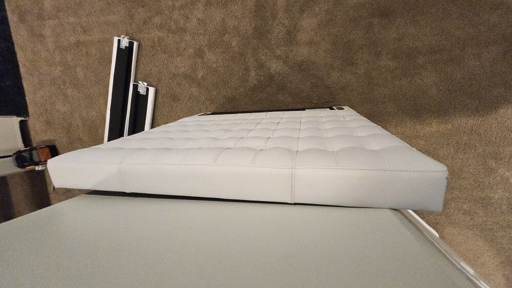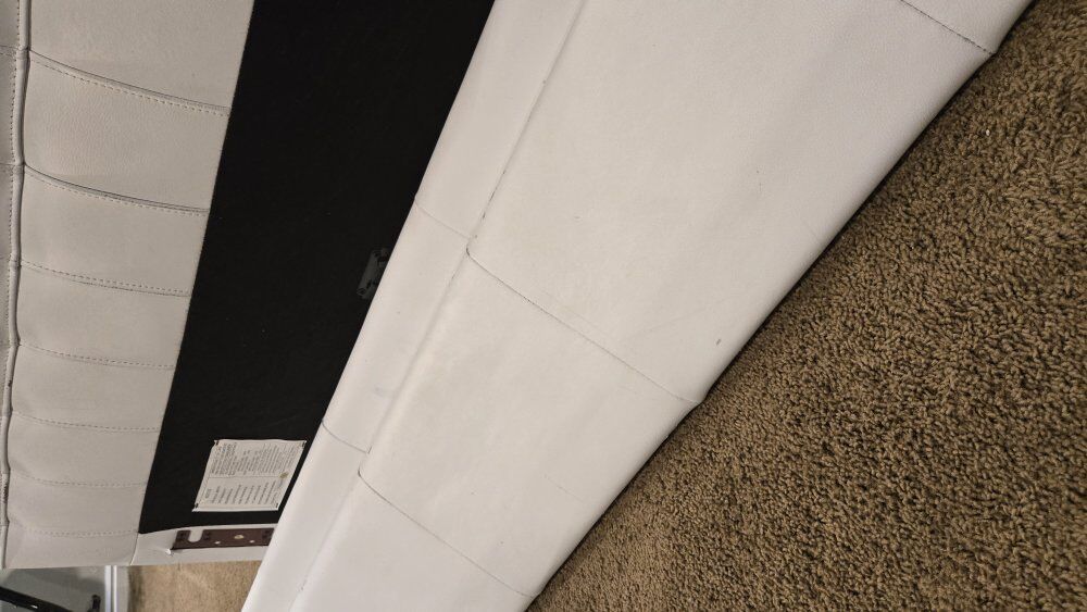 ZelleTwin Bed in white "leather"....looks like leather but I'm pretty sure it is fake leather. The visible parts (head board and side rails) are in good condition. the foot board saw a little too much foot over the years and looks a little worn.....but 98% of the time the footboard is covered by your blankets and you don't see it.