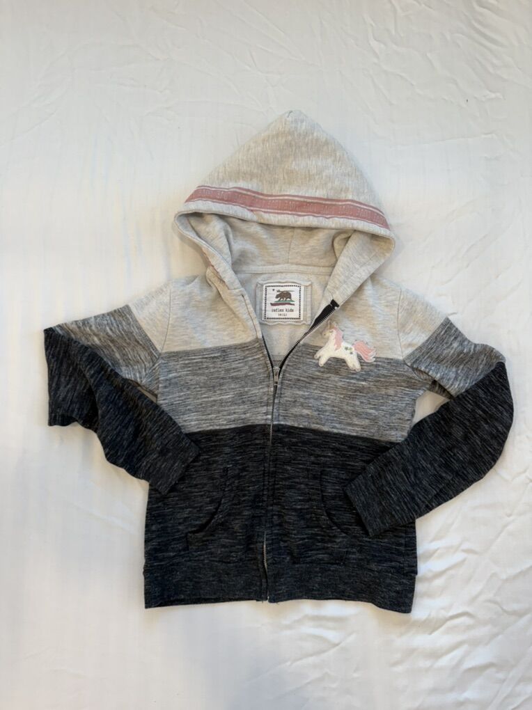 Unicorn Jacket Girls L (14-16) $7.00 Girls three stripe unicorn jacket. Lightweight and cozy with a cute unicorn patch and hood detail.