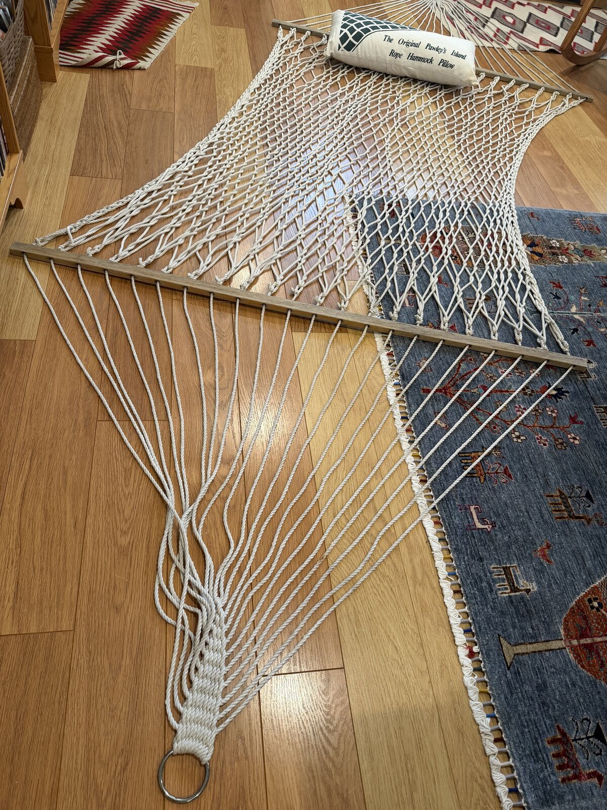 VenmoPawleys Island cotton rope hammock with matching pillow in good condition. Soft, handwoven cotton with sturdy wooden spreader bars creates a super comfortable spot for reading or napping. Pillow included for extra head and neck support. Ideal for porch, patio, or backyard. Spreader bars could use refinishing for classic looks, or used as they are.