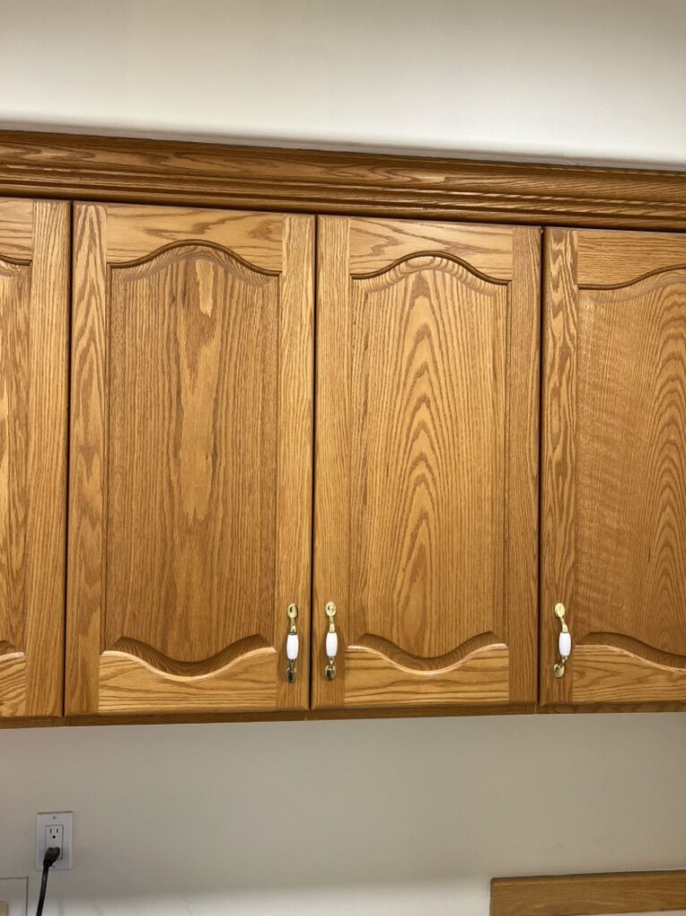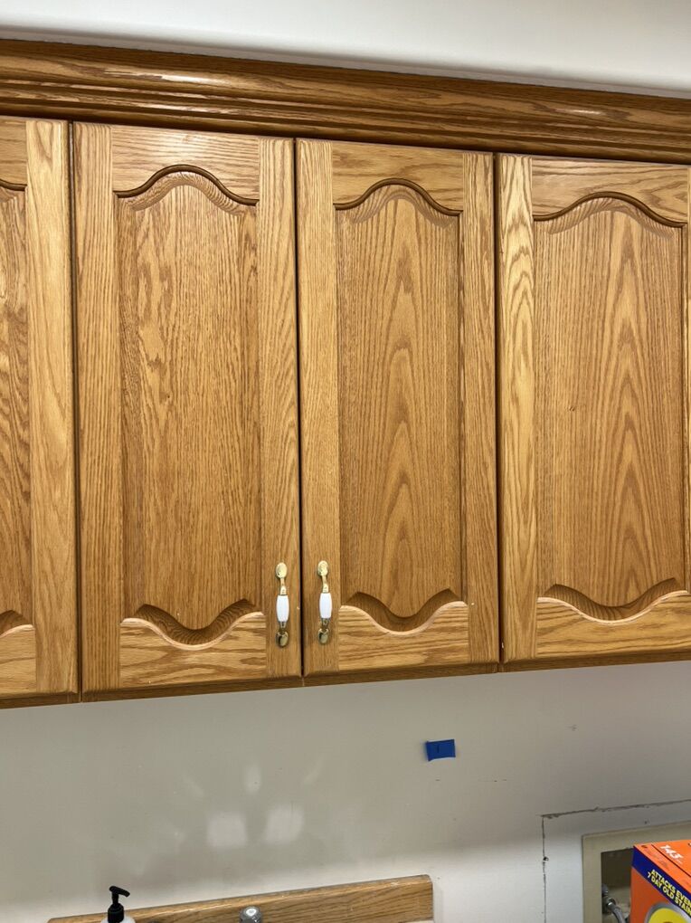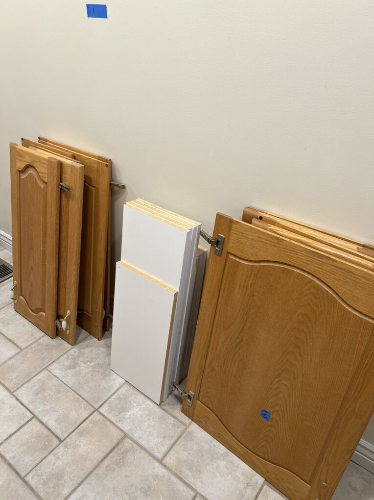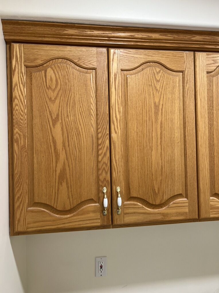 VenmoLaundry room cabinets. Solid Oak. Sink and faucet included. Uppers: 34.75 wide x 34.25 tall x 12 deep (there is a hole in the top of this cabinet box that was for a laundry drop) 25.5 wide x 34.25 tall x 12 deep 25.5 wide x 34.25 tall x 12 deep 31 wide x 34.25 tall x 12 deep 31 wide x 34.25 tall x 12 deep 20.875 wide x 34.25 tall x 12 deep -There is a 1/2 reveal below the edge of the cabinet box that can be used for an LED light strip under cabinet lighting. Lower Cabinets 15.75 wide x 30 tall x 21 deep 12 wide x 30 tall x 21 deep 28.75 wide x 36 tall x 24 deep (sink) 23.25 wide x 36.25 tall x 24 deep Countertop for the desk is 55.75 wide and 1.5 thick. The white in the middle of the counter is where a sewing machine was mounted. Lower cabinet measurements for the desk are from the floor to top edge of desk. We are remodeling and these need to go. They are ready for installation.