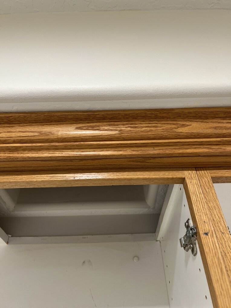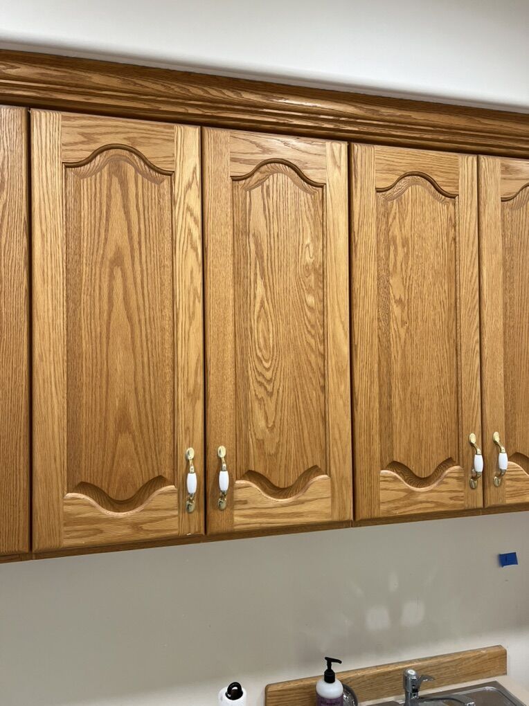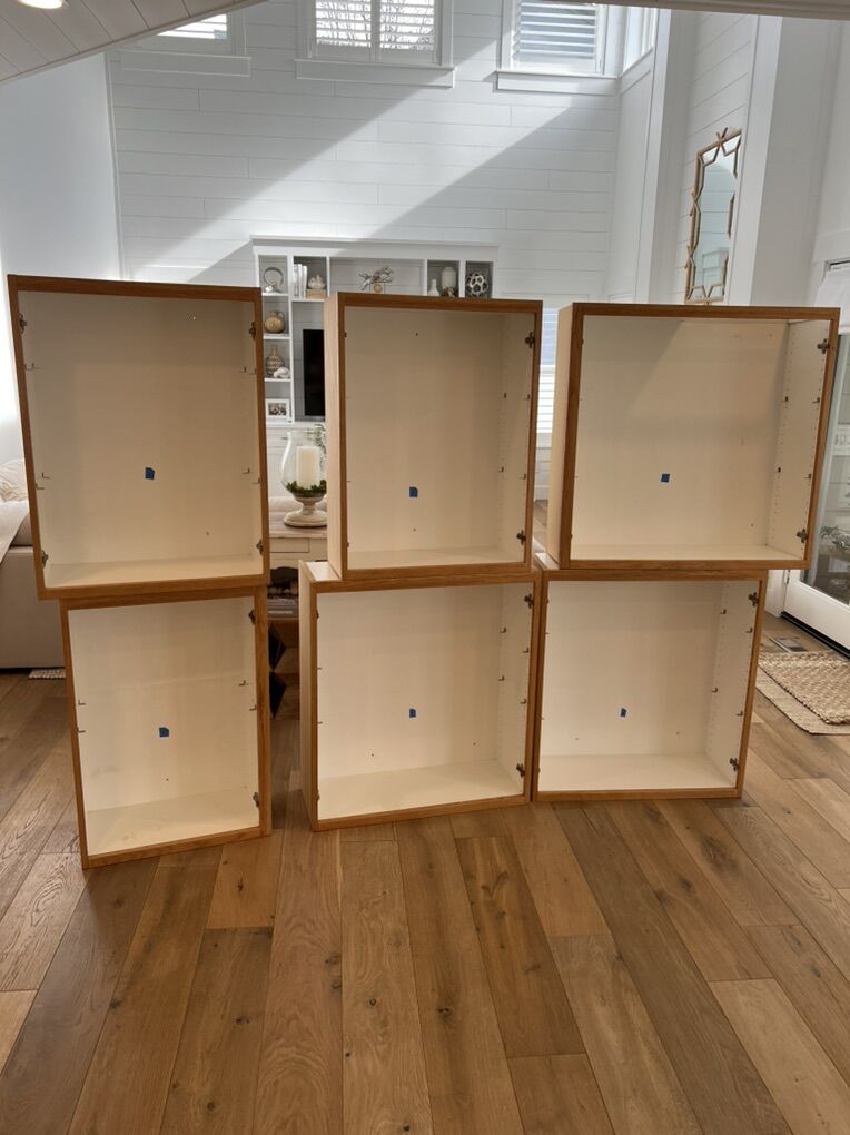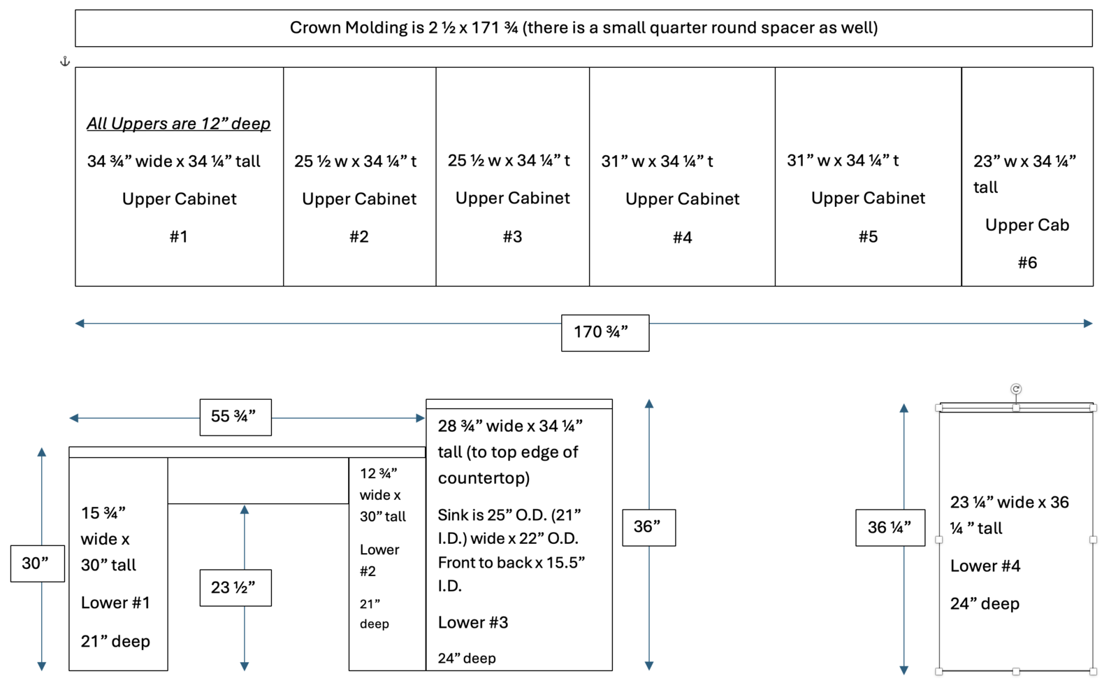 VenmoLaundry room cabinets. Solid Oak. Sink and faucet included. Uppers: 34.75 wide x 34.25 tall x 12 deep (there is a hole in the top of this cabinet box that was for a laundry drop) 25.5 wide x 34.25 tall x 12 deep 25.5 wide x 34.25 tall x 12 deep 31 wide x 34.25 tall x 12 deep 31 wide x 34.25 tall x 12 deep 20.875 wide x 34.25 tall x 12 deep -There is a 1/2 reveal below the edge of the cabinet box that can be used for an LED light strip under cabinet lighting. Lower Cabinets 15.75 wide x 30 tall x 21 deep 12 wide x 30 tall x 21 deep 28.75 wide x 36 tall x 24 deep (sink) 23.25 wide x 36.25 tall x 24 deep Countertop for the desk is 55.75 wide and 1.5 thick. The white in the middle of the counter is where a sewing machine was mounted. Lower cabinet measurements for the desk are from the floor to top edge of desk. We are remodeling and these need to go. They are ready for installation.