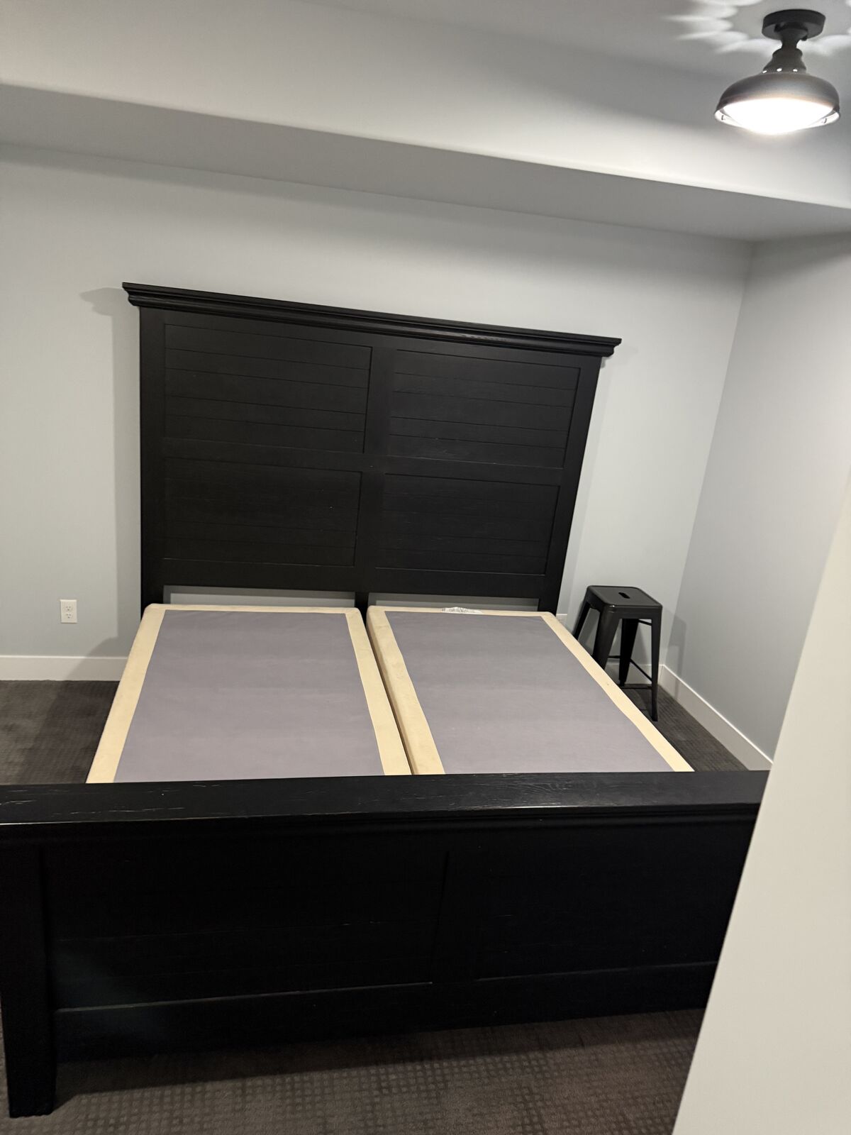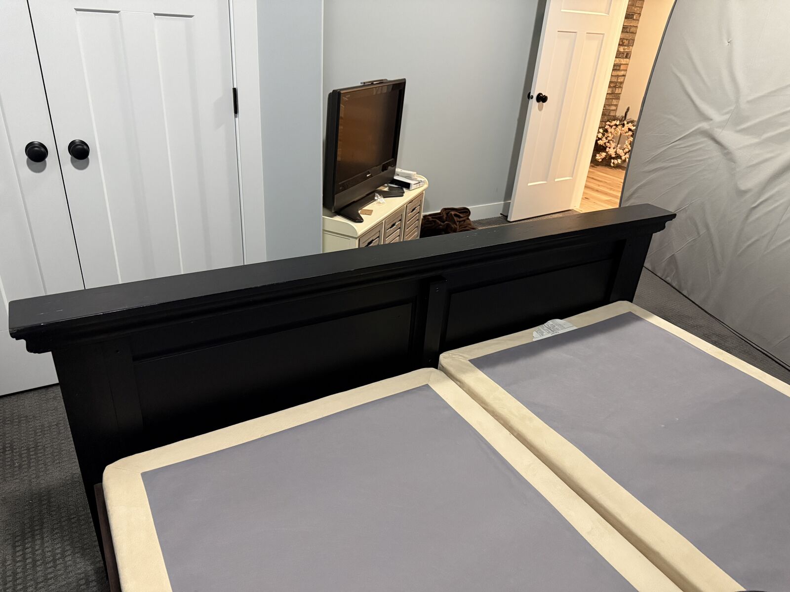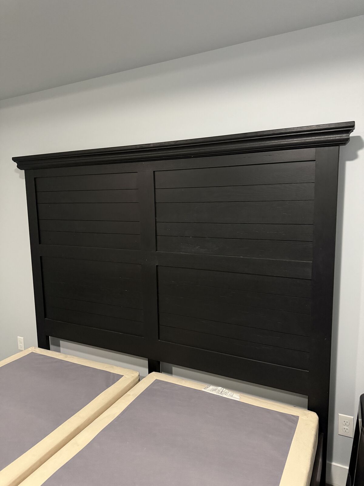 ApplePayKING SIZE BED FRAME -SOLID WOOD, BLACK Sturdy king-size bed frame with aclassic, timeless look. Solid wood construction with a rich black finish. Features a Tall paneled headboard and matching footboard. Very strong and well-built. Fits a standard king mattress and box spring. Good pre-owned condition with light cosmetic wear. Great statment piece for any bedroom. Will include two twin box springs for $100 extra