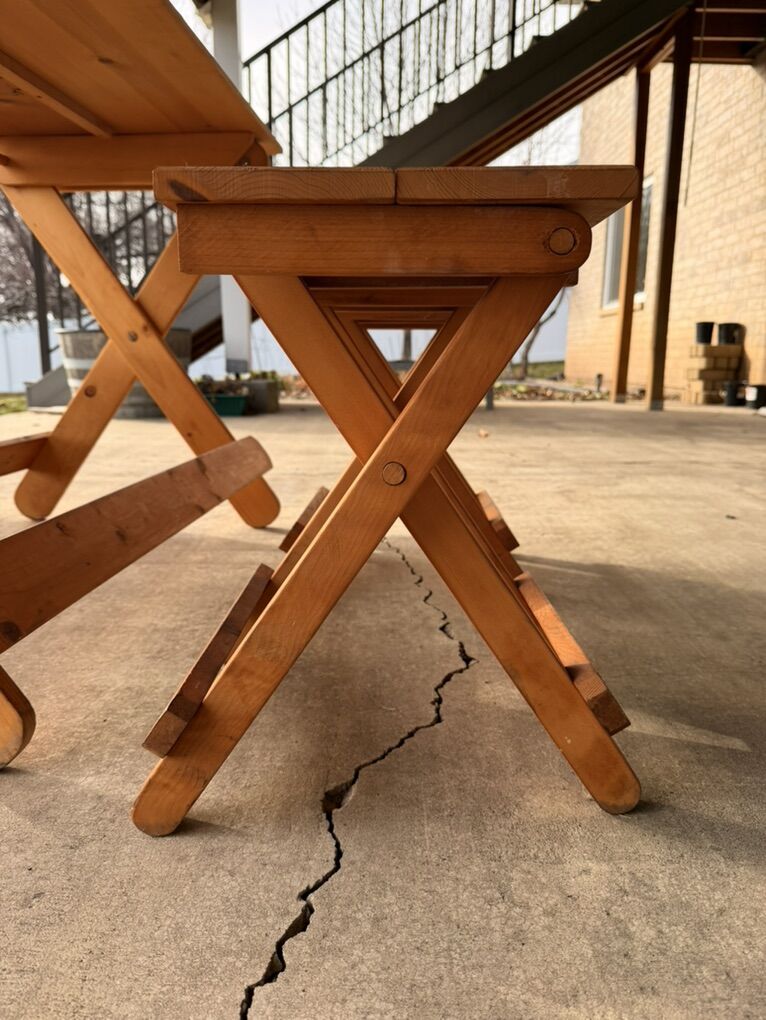 VenmoFunctional wood table with four stools. Table folds down flat as do the stools. The stools slide inside table when folded. Table has dings and cracks but is in good condition.