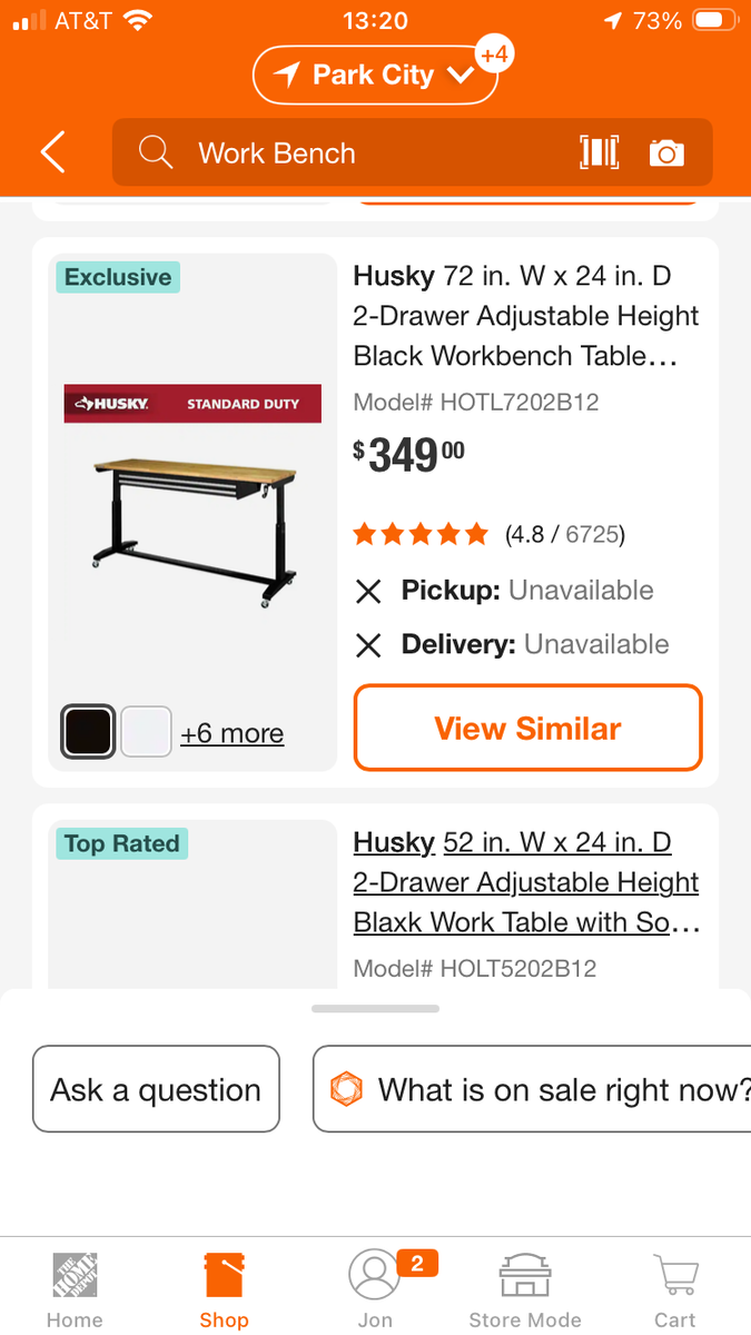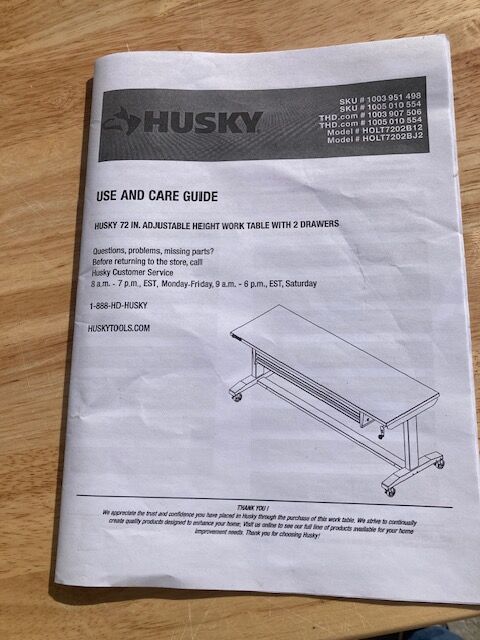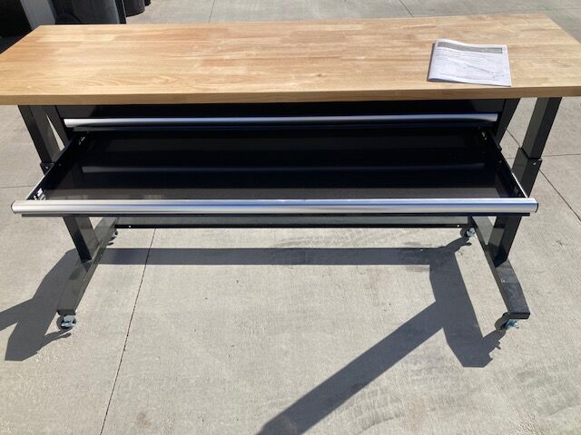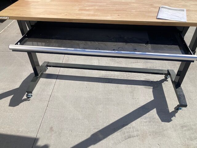 Husky work bench. measures 72 inches wide by 24 inches deep. Height is adjustable and has two drawers. Bench is in excellent condition. (has only 3 small scratches) It's a very solid bench. It currently has casters on it but also has adjustable feet that screw into the bottom of the legs. The bench costs $350 new at Home Depot. Please bring a truck or trailer. I can help load it onto your truck.