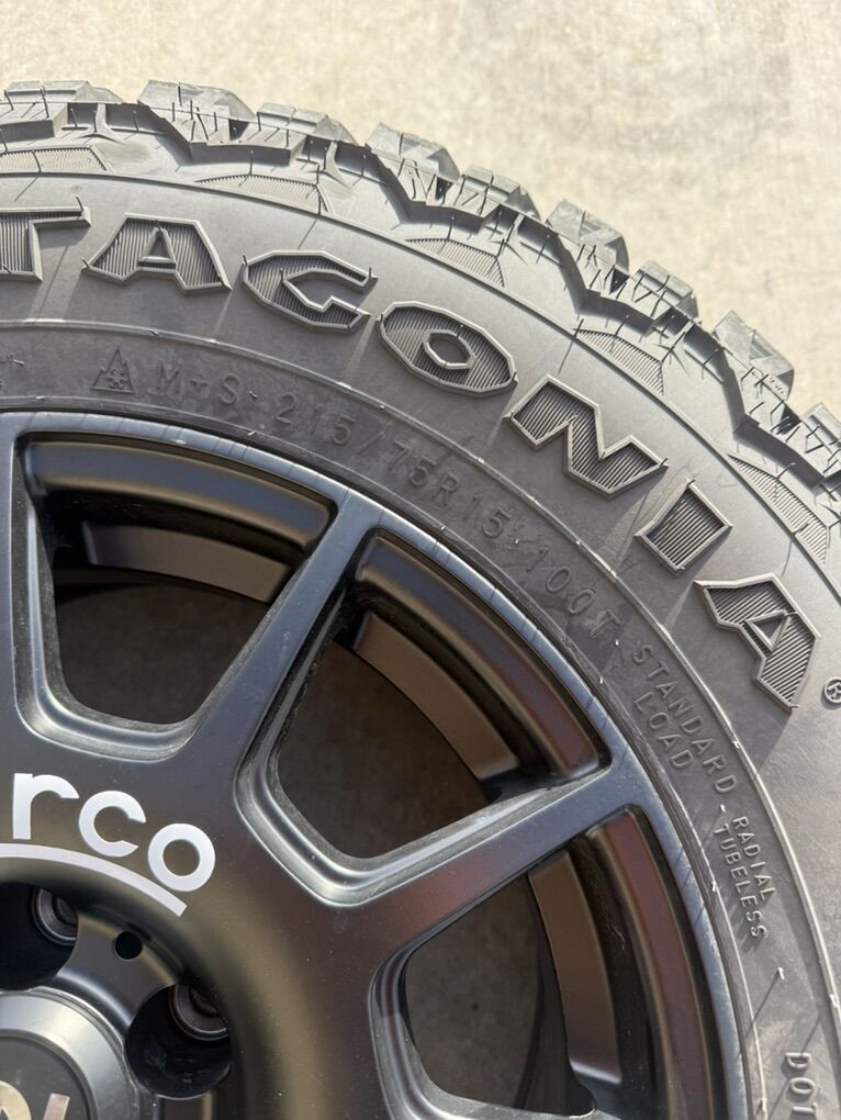 VenmoSparco wheels 15x7, +15 offset, 5x100 Milestar Patagonia AT pro tires 215/75R15 This setup was purchased new, less that 1k miles. Zero damage, just thinking of trying something different. Setup was 1500 new.