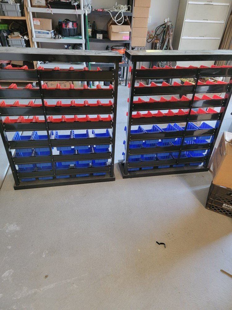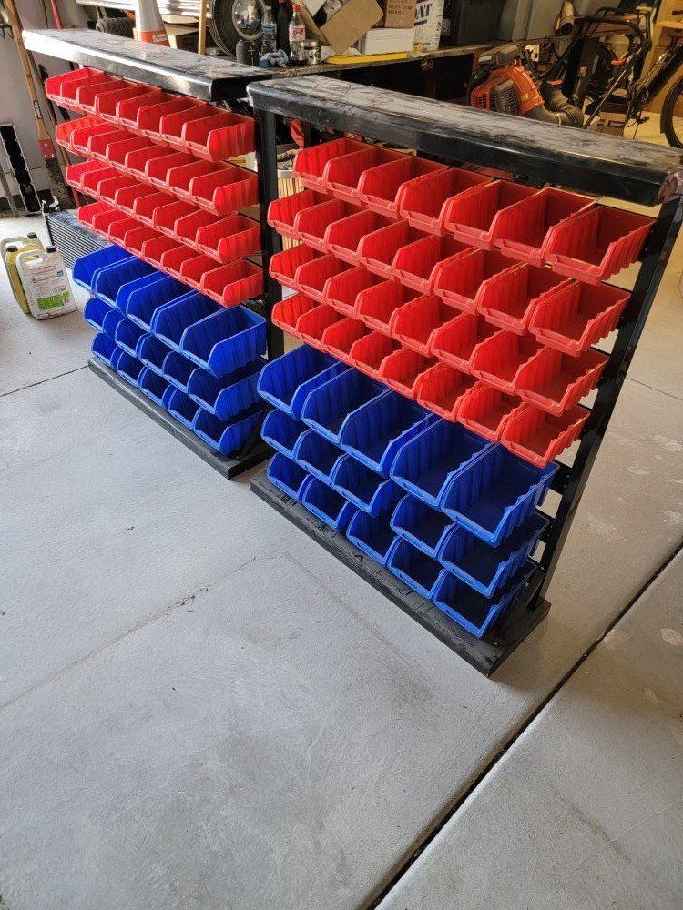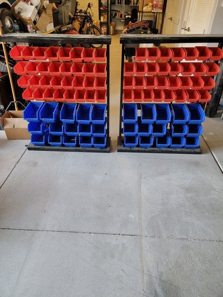 Red and Blue Bins with rack. Can be free standing or mounted to a wall. 37"x11"x 45".