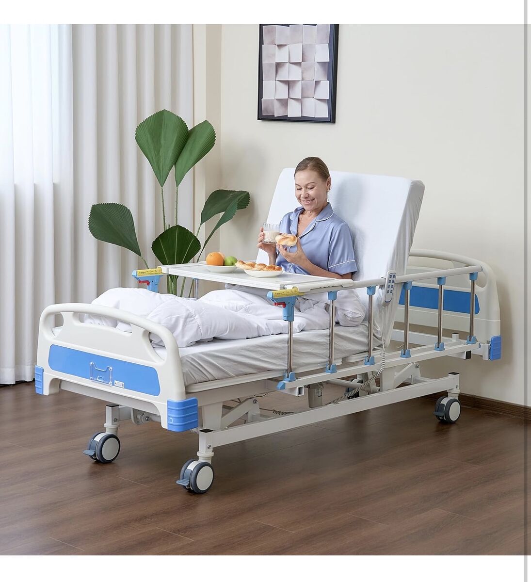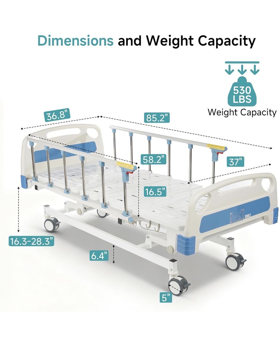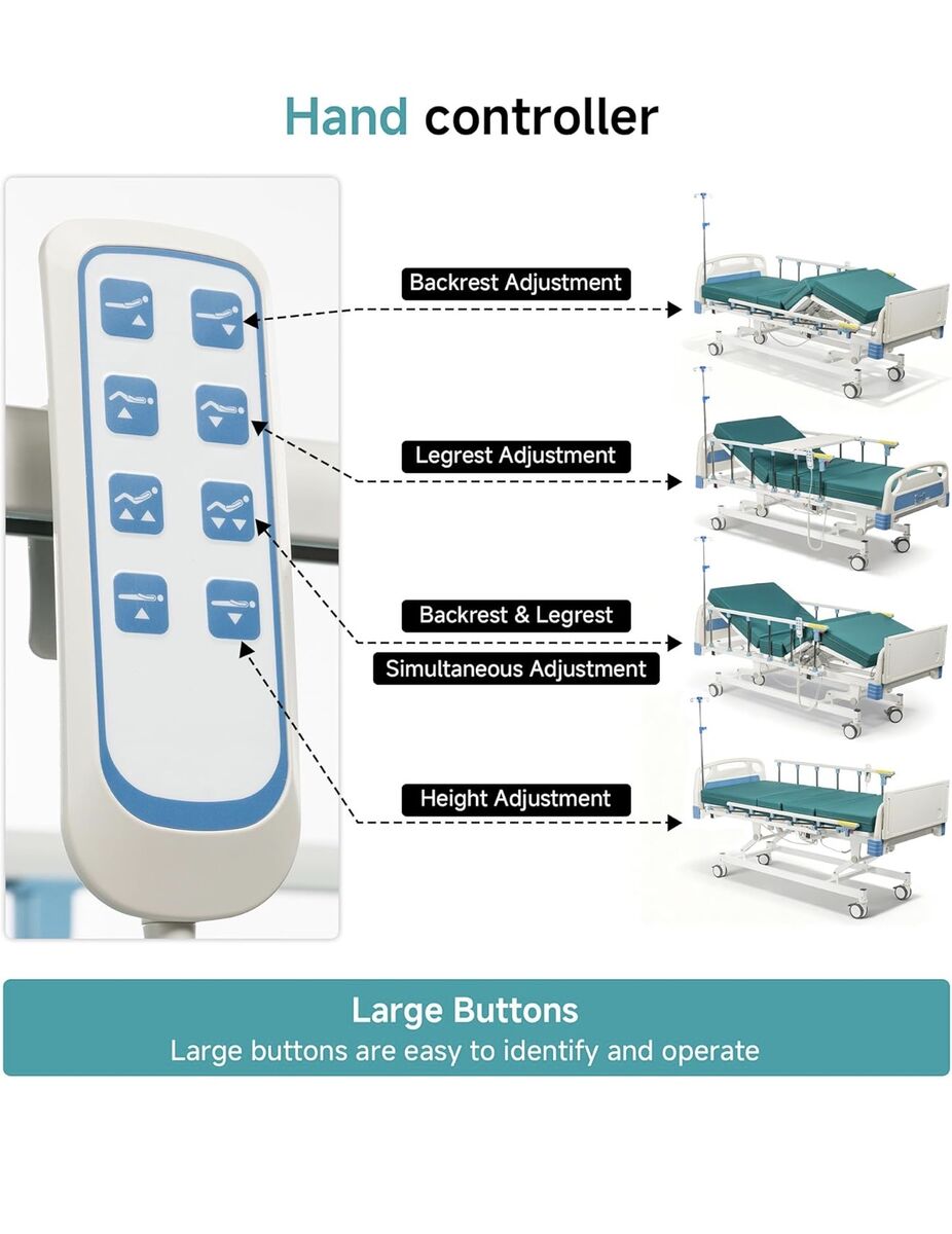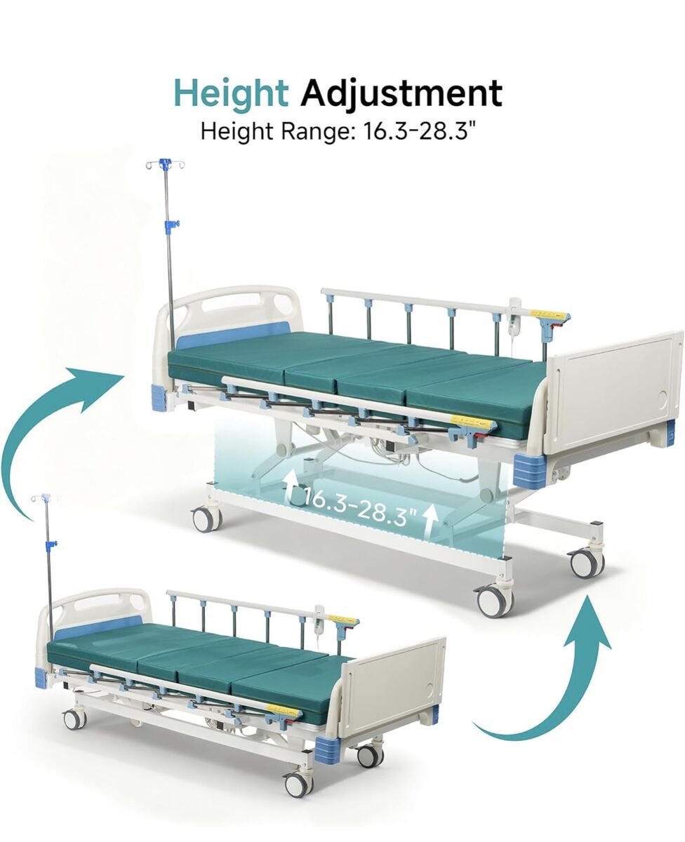 ELENKER Full Electric Hospital Bed for Home Use, ICU Medical Bed, Premium 3 Function Hospital ICU Bed with Remote Control, IV Pole, Mattress, Dining table, Lockable Quiet Casters, Includes Sheets (2X)