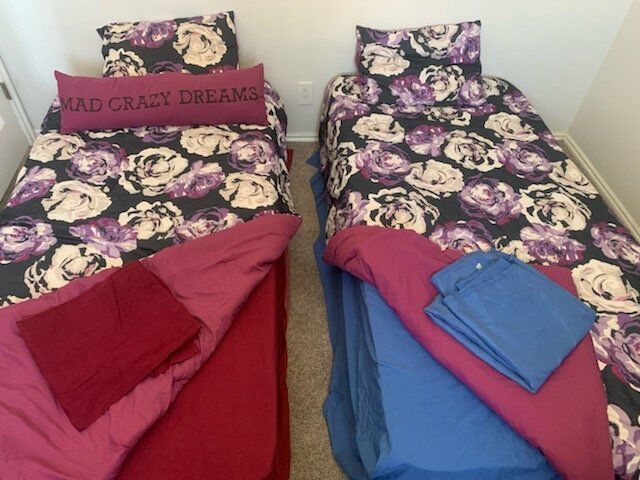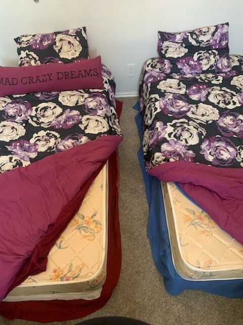 two complete Twin Bed sets! frame, box spring, mattress, bed skirt, pillows, sheets, and comforter! these were used in guest bedroom for a handful of visits and then covered and put in storage for a bit. Like new firm and soft! no dipping or wear very comfortable. $45 for one complete set or $70 for both! these are clean and in good shape pick up in provo DELIVERY - utah county $30 DELIVERY - SL county $45