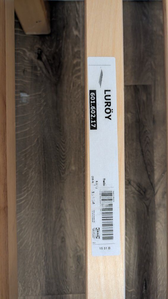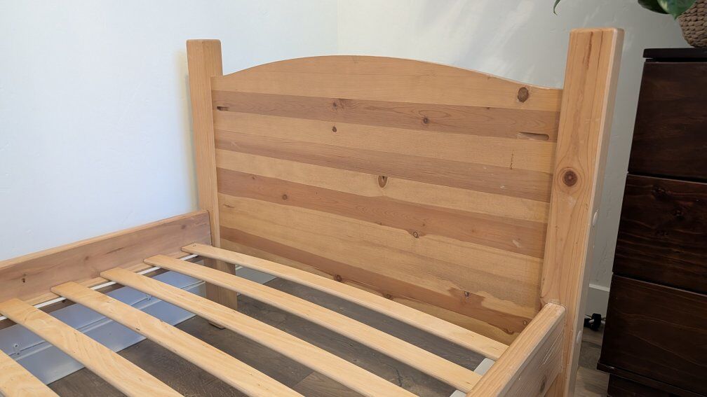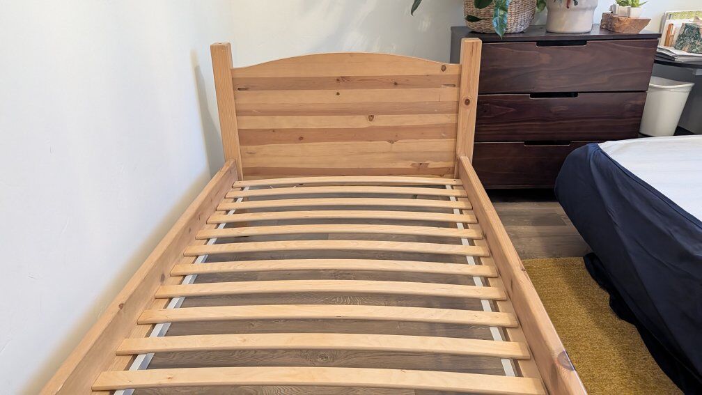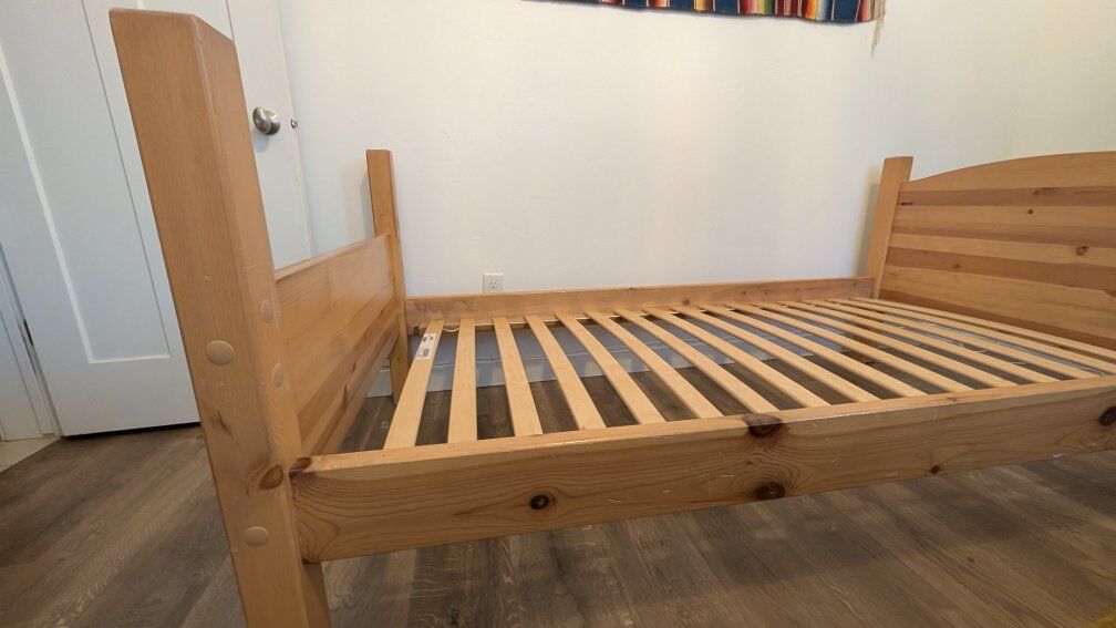 Solid wood bedframe with IKEA Luroy slats. Built to last. Originally a bunk bed but no top bunk included. Ladder is free if you're interested. Mattress not included.