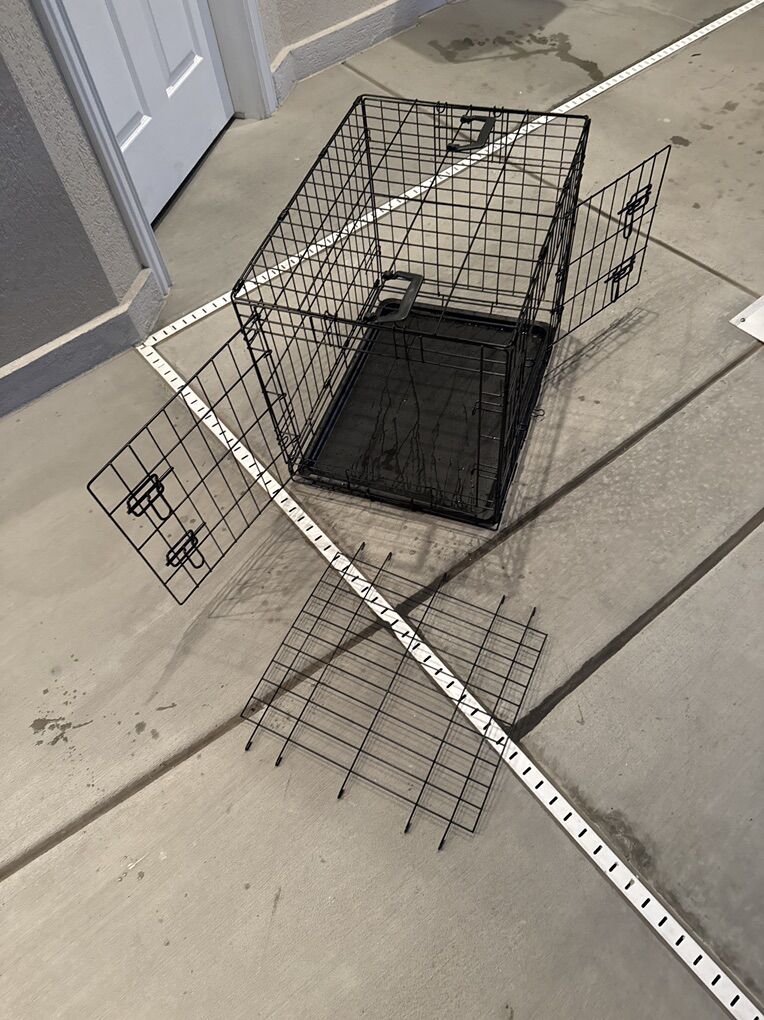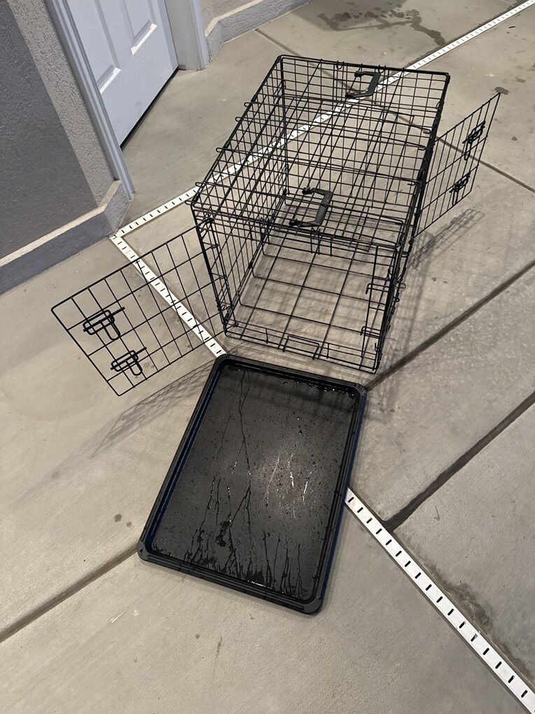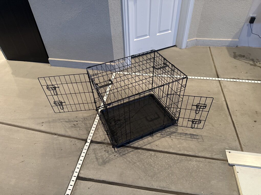 VenmoWire kennel with two locking doors and two carrying handles. Plastic removable tray for easy cleaning. Has extra wire separating spacer.