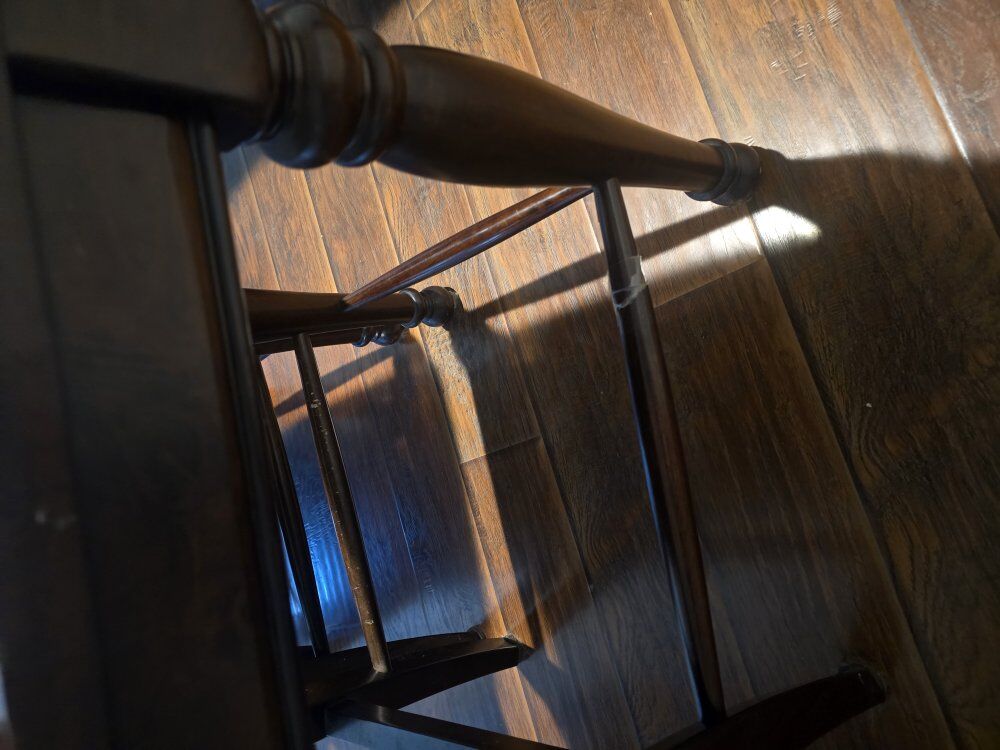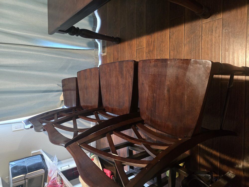 Venmodimensions are 54"x54 the middle piece comes out if you want to make it smaller. Comes with 4 chairs. one chair has a split cross member between the legs (see photo). It could easily be fixed though. its very sturdy and built well.