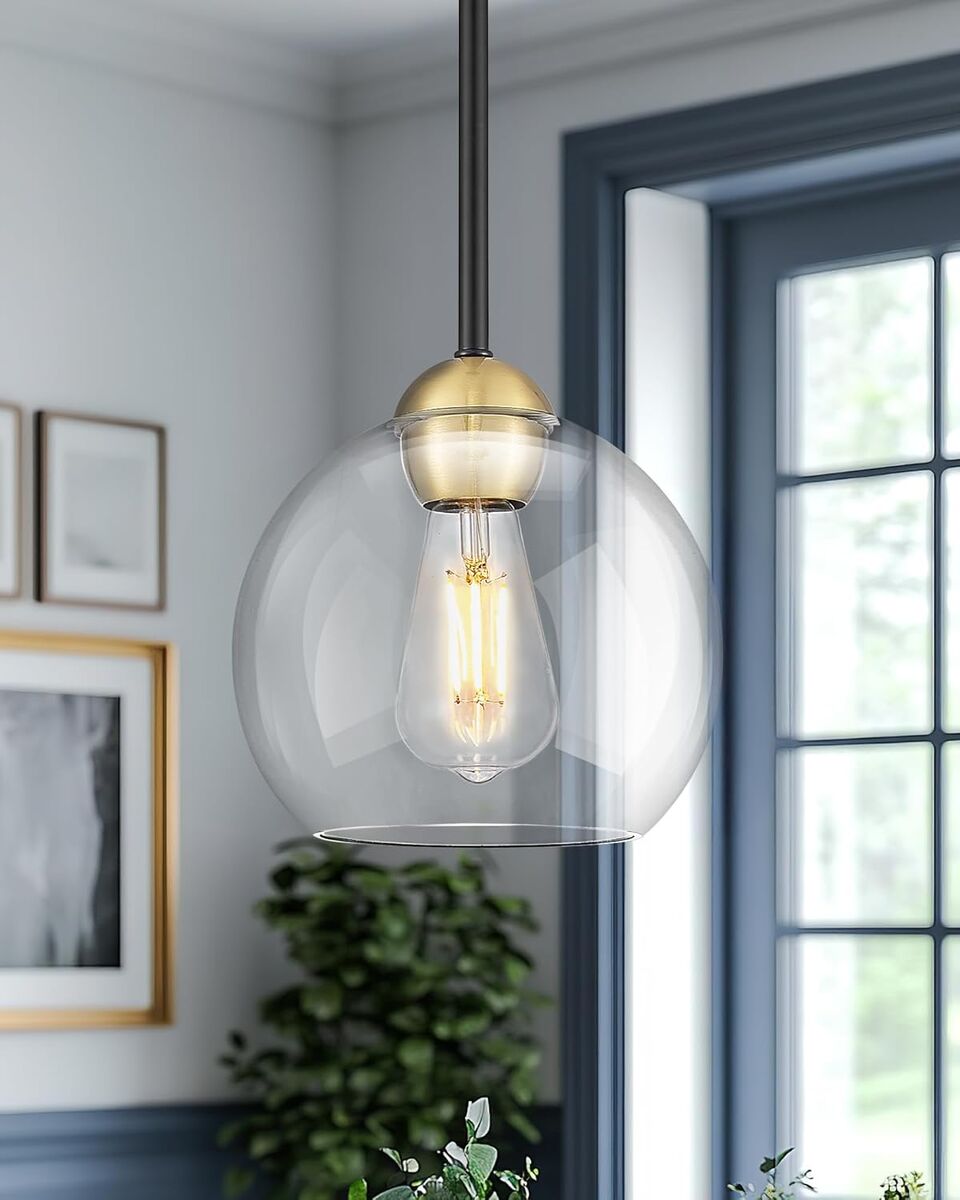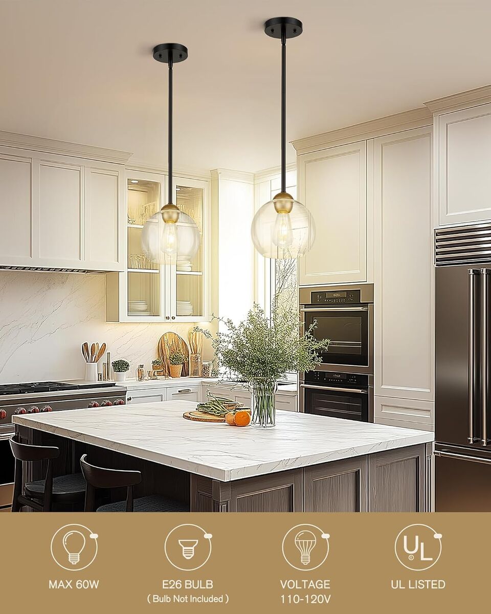 ApplePayEmak Modern 8 Inch Glass Pendant Lights Kitchen Island, 2 Pack Black and Gold Pendant Light Fixtures, Farmhouse Globe Island Lights for Kitchen, Dining Room, Bathroom, PL121-BKBGD-CG-2PK